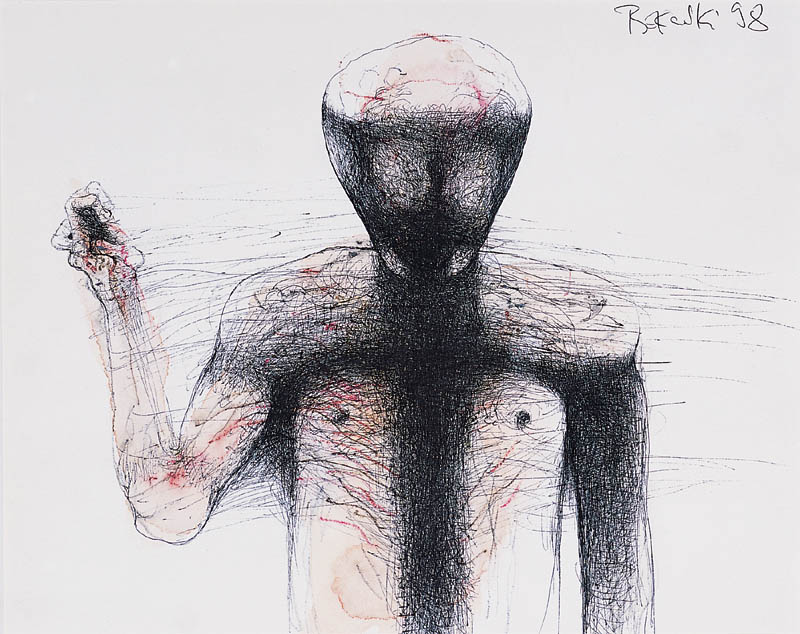 Zdzisław Beksiński (Sanok 24 II 1929 - Warszawa 21 II 2005) studiował w latach 1947-1952 na Wydziale Architektury Politechniki Krakowskiej. Był artystą samoukiem, który osiągnął niekwestionowaną pozycję w polskiej sztuce współczesnej, potwierdzoną obecnością jego prac na prestiżowych wystawach i w kolekcjach muzealnych. Początkowo zajmował się fotografią, którą interesował się od lat studenckich, po 1956 zyskując uznanie jako twórca fotogramów o estetyce opartej o efekty fakturowe. W latach 1958-1962 tworzył abstrakcyjne obrazy-reliefy o bogatej fakturze, głównie metalowe, będące odmianą malarstwa materii. Pod koniec tego okresu powstawały ażurowe formy o kształtach figur i pełnoplastyczne rzeźby w metalu. Kolejnym etapem jego twórczości były lata 1962-1974, kiedy poświęcał się głównie rysunkowi. W latach 60. rysował piórkiem i tuszem figuralne kompozycje odznaczające się karykaturalną deformacją postaci. Od końca lat 60. tworzył rysunki węglem i kredkami, będące monochromatyczną odmianą jego równoległej twórczości malarskiej. Od 1974 zajmował się niemal niepodzielnie malarstwem. Jego charakterystyczny styl bazował na perfekcji technicznej, której towarzyszyła niezwykłość wizji. Malował świat po katastrofie, naznaczony piętnem śmierci i rozpadu. Jego obrazy zaludniają postaci i stwory o ludzkich wprawdzie bądź zwierzęcych kształtach, lecz o cechach fantomów, automatów lub rozpadających się trucheł. Artysta nie nadawał swym obrazom i rysunkom tytułów (poza porządkującymi symbolami), akcentując w ten sposób swój brak zainteresowania dla literackiej strony przedstawień. Sam mówił, że malując całkowicie poddaje się wizji, „fotografuje“ ją. W ostatnich latach włączył do swego warsztatu artystycznego elektroniczne techniki generowania obrazu, które wykorzystywał do tworzenia komputerowych fotomontaży. Sztuka Beksińskiego, wielokrotnie wystawiana i omawiana, budzi skrajne emocje wśród znawców i publiczności.