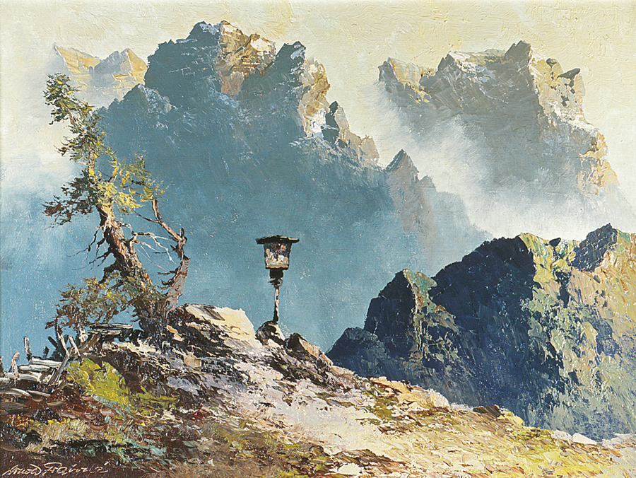 PEJZAŻ ALPEJSKI Z KAPLICZKĄ, lata 30. XX w.