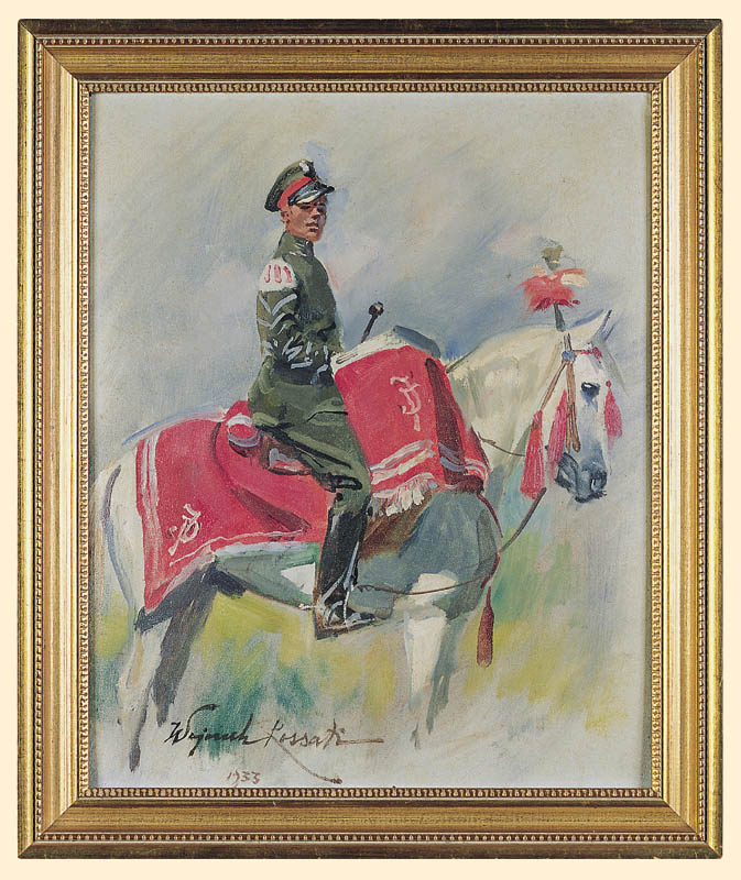 Wojciech Kossak (Paryż 1856 - Kraków 1942 ) – powszechnie znany malarz, postrzegany przede wszystkim jako świetny batalista. Syn i uczeń Juliusza Kossaka kształcił się w krakowskiej Szkole Sztuk Pięknych, w Akademii monachijskiej oraz w Paryżu. W latach 1895-1902 przebywał głównie w Berlinie, pracując dla cesarza Wilhelma II. Wiele podróżował, m.in. do Hiszpanii i Egiptu, gdzie wykonywał szkice do zamierzonych panoram. W późniejszych latach kilkakrotnie wyjeżdżał do Stanów Zjednoczonych wykonując zamówienia portretowe. W 1913 był mianowany profesorem warszawskiej Szkoły Sztuk Pięknych. W latach I wojny światowej pełnił służbę wojskową. Był współautorem panoram: „Racławice” (1893-1894), „Berezyna” (1895-1896), „Bitwa pod piramidami” (1901) oraz szkiców do niezrealizowanej „Somosierry” (1900). Z temperamentem i swobodą tworzył szeroko malowane, dynamiczne sceny batalistyczne, historyczne, rodzajowe oraz liczne portrety. Z upodobaniem malował konie. Jego obrazy, gloryfikujące dawne i współczesne artyście polskie wojsko i bohaterstwo żołnierzy, trafiały do patriotycznych uczuć odbiorców i cieszyły się ogromna popularnością.