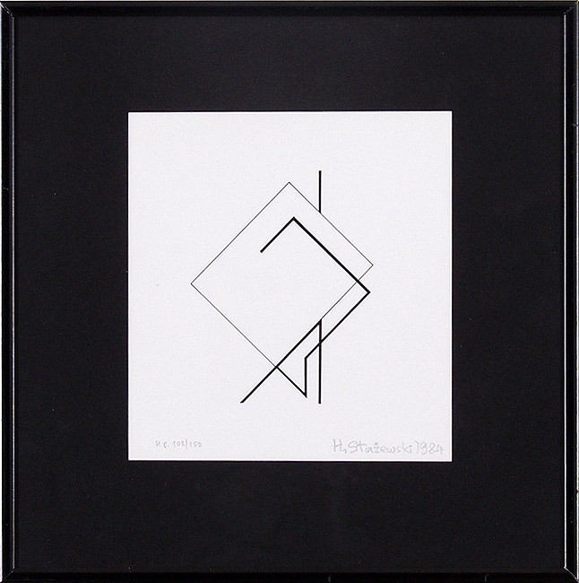 Henryk Stażewski (Warszawa 9 I 1894 - Warszawa 10 VI 1988) studiował w Szkole Sztuk Pięknych w Warszawie w latach 1913-1920. W początkach kariery malował martwe natury. Przejściowo wystawiał z ugrupowaniem „Formiści” (1922). Wziął też udział w Wystawie Nowej Sztuki w Wilnie w 1923. O tego czasu tworzył pod wpływem konstruktywizmu. Obok kompozycji malarskich trudnił się grafiką książkową, projektował wnętrza, sprzęty, a także scenografie – były to w większości prace teoretyczne i studyjne. Polskie i międzyna-rodowe ugrupowania awangardy, z którymi wystawiał i współpracował jako publicysta, to kolejno: „Blok” (1924-1926), „Praesens” (1926-1930), „Cercle et Carré” (1929-1931), „Abstraction-Création” (1931-1939), „a. r.” (1932-1939). Należał też do Koła Artystów Grafików Reklamowych (1933-1939). W 1930 był współorganizatorem zbiórki dzieł artystów międzynarodowej awangardy przeznaczonych dla muzeum łódzkiego (obecnie w Muzeum Sztuki w Łodzi). Po II wojnie mieszkał i działał w Warszawie. W latach 40. i 50. podejmował próby dostosowania się do postulatów sztuki figuratywnej. Z tego okresu pochodzą rysunkowe i malarskie kompozycje o tematyce pracy, budowy, a także projekty monumentalne. Po 1956, uznawany powszechnie za patrona polskiej awangardy, uprawiał już wyłącznie abstrakcję o konstruktywistycznym rodowodzie. Tworzył cykle prac, będących studiami płaszczyzn, linii, kolorów w różnych układach względem siebie. Przy pozorach chłodnej perfekcji umiał nasycić je emocją bezpośredniego dotknięcia, śladu ręki. Obok malarstwa i form pochodnych, jak collages, reliefy, multiple, tworzył formy przestrzenne i grafikę (autoryzował serigraficzne repliki swoich prac). Był laureatem wielu nagród i odznaczeń krajowych i zagranicznych, w tym Nagrody Herdera, Wiedeń 1972.