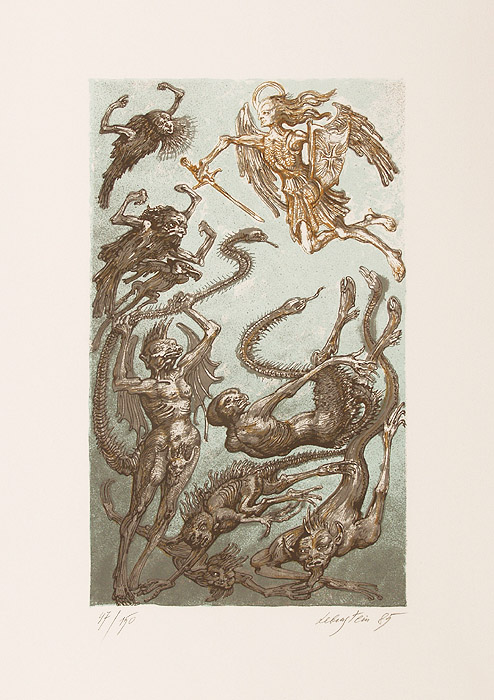 Jan Lebenstein (Brześć Litewski 1930 - Kraków 1999) w latach 1948-1954 studiował malarstwo w ASP w Warszawie pod kierunkiem prof. Eugeniusza Eibischa i Artura Nachta-Samborskiego. W 1955 wziął udział w wystawie w warszawskim Arsenale. Zaprzyjaźniony w czasie studiów z Mironem Białoszewskim, swą pierwszą wystawę indywidualną pokazał w 1956 w Teatrze na Tarczyńskiej. W 1959 zdobył Grand Prix de la Ville de Paris na I Biennale Młodych w Paryżu i w tym roku przeniósł się na stałe do Paryża. Po seriach "figur kreślonych" (na papierze milimetrowym) i "figur hieratycznych" z lat 1955-1958 maluje cykl "figur osiowych" (1958-1962), które wystawia w Paryżu i USA. Równolegle w 1960 zaczyna rysowane "karnety", rodzaj dziennika, który w przyszłości dostarczy motywów wykorzystanych w obrazach. W latach 1964-1965 maluje "Bestiarium", cykl fakturowych, archaizowanych stworów przypominających prehistoryczne wykopaliska. Bezpośrednio po nich wprowadza do swych obrazów postaci ludzkie i fantastyczne, odgrywające sceny ni to mitologiczne, ni to ze snu, często przesycone erotyką. W 1970 projektuje witraże dla Centre du Dialogue w Paryżu. W W 1971 otrzymuje obywatelstwo francuskie 1974 powstają gwasze inspirowane Folwarkiem zwierzęcym George'a Orwella. W latach 1976-1989 tworzy wyłącznie w technice gwaszu i pastelu, podejmując tematykę mitologiczną i zaczerpniętą z Biblii: cykle ilustracji do Księgi Hioba (wyd. 1979) i do Apokalipsy (wyd. 1986) w nowych przekładach Czesława Miłosza. W 1989 powraca do malarstwa olejnego (cykl "Pergamon"). Artysta otrzymał m. in. nagrodę Fundacji im. Alfreda Jurzykowskiego w 1976, Nagrodę Muzeum Archidiecezji Warszawskiej w 1985, Nagrodę im. Jana Cybisa w 1987.