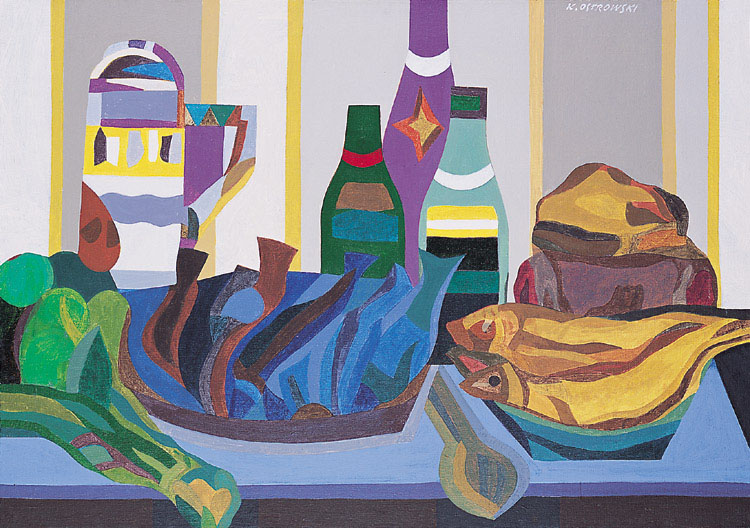 Kazimierz "Kachu" Ostrowski od 1920 mieszkał w Poznaniu, od 1934 w Gdyni. Podczas wojny był więźniem obozu koncentracyjnego w Stutthofie. W 1945 wstąpił do Państwowej Wyższej Szkoły Sztuk Plastycznych w Sopocie, gdzie studiował malarstwo pod kierunkiem Janusza Strzałeckiego, Artura Nachta-Samborskiego i Jacka Żuławskiego. W latach 1949-1950 przebywał w Paryżu na stypendium rządu francuskiego. Uczęszczał do pracowni Fernanda Légera. Po powrocie do kraju zajmował się malarstwem, rysunkiem, projektowaniem tkanin oraz malarstwem ściennym i witrażem. Wykonywał m.in. polichromie fasad odbudowanych kamienic Starego Miasta w Gdańsku i Poznaniu. W latach 1964-1987 pracował jako pedagog w Państwowej Wyższej Szkole Sztuk Plastycznych w Gdańsku. Malarstwo Ostrowskiego wiele zawdzięcza kontaktom ze sztuką Légera i innych przedstawicieli awangardy XX wieku. Artysta tworzy kompozycje zbudowane z uproszczonych, zgeometryzowanych elementów, odznaczające się bogatą kolorystyką i dekoracyjnością. Często podejmował tematykę marynistyczną lub związaną z pracą, wykonywał kompozycje figuralne w typie panneaux. Wielokrotnie wystawiał na przeglądowych wystawach, m.in. III i IV Ogólnopolskiej Wystawie Plastyki, 1953 i 1954, II i III Wystawie Sztuki Nowoczesnej, Warszawa 1957 i 1959, Wystawie Malarstwa w XV-lecie PRL, Muzeum Narodowe, Warszawa 1961, Festiwalach Polskiego Malarstwa Współczesnego w Szczecinie 1962, 1966, 1968, 1970, 1972, 1982. W roku 1988 został laureatem prestiżowej nagrody im. Jana Cybisa.