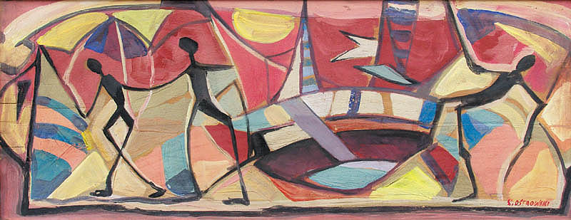 Kazimierz "Kachu" Ostrowski od 1920 mieszkał w Poznaniu, od 1934 w Gdyni. Podczas wojny był więźniem obozu koncentracyjnego w Stutthofie. W 1945 wstąpił do Państwowej Wyższej Szkoły Sztuk Plastycznych w Sopocie, gdzie studiował malarstwo pod kierunkiem Janusza Strzałeckiego, Artura Nachta-Samborskiego i Jacka Żuławskiego. W latach 1949-1950 przebywał w Paryżu na stypendium rządu francuskiego. Uczęszczał do pracowni Fernanda Légera. Po powrocie do kraju zajmował się malarstwem, rysunkiem, projektowaniem tkanin oraz malarstwem ściennym i witrażem. Wykonywał m.in. polichromie fasad odbudowanych kamienic Starego Miasta w Gdańsku i Poznaniu. W latach 1964-1987 pracował jako pedagog w Państwowej Wyższej Szkole Sztuk Plastycznych w Gdańsku. Malarstwo Ostrowskiego wiele zawdzięcza kontaktom ze sztuką Légera i innych przedstawicieli awangardy XX wieku. Artysta tworzy kompozycje zbudowane z uproszczonych, zgeometryzowanych elementów, odznaczające się bogatą kolorystyką i dekoracyjnością. Często podejmował tematykę marynistyczną lub związaną z pracą, wykonywał kompozycje figuralne w typie panneaux. Wielokrotnie wystawiał na przeglądowych wystawach, m.in. III i IV Ogólnopolskiej Wystawie Plastyki, 1953 i 1954, II i III Wystawie Sztuki Nowoczesnej, Warszawa 1957 i 1959, Wystawie Malarstwa w XV-lecie PRL, Muzeum Narodowe, Warszawa 1961, Festiwalach Polskiego Malarstwa Współczesnego w Szczecinie 1962, 1966, 1968, 1970, 1972, 1982. W roku 1988 został laureatem prestiżowej nagrody im. Jana Cybisa.