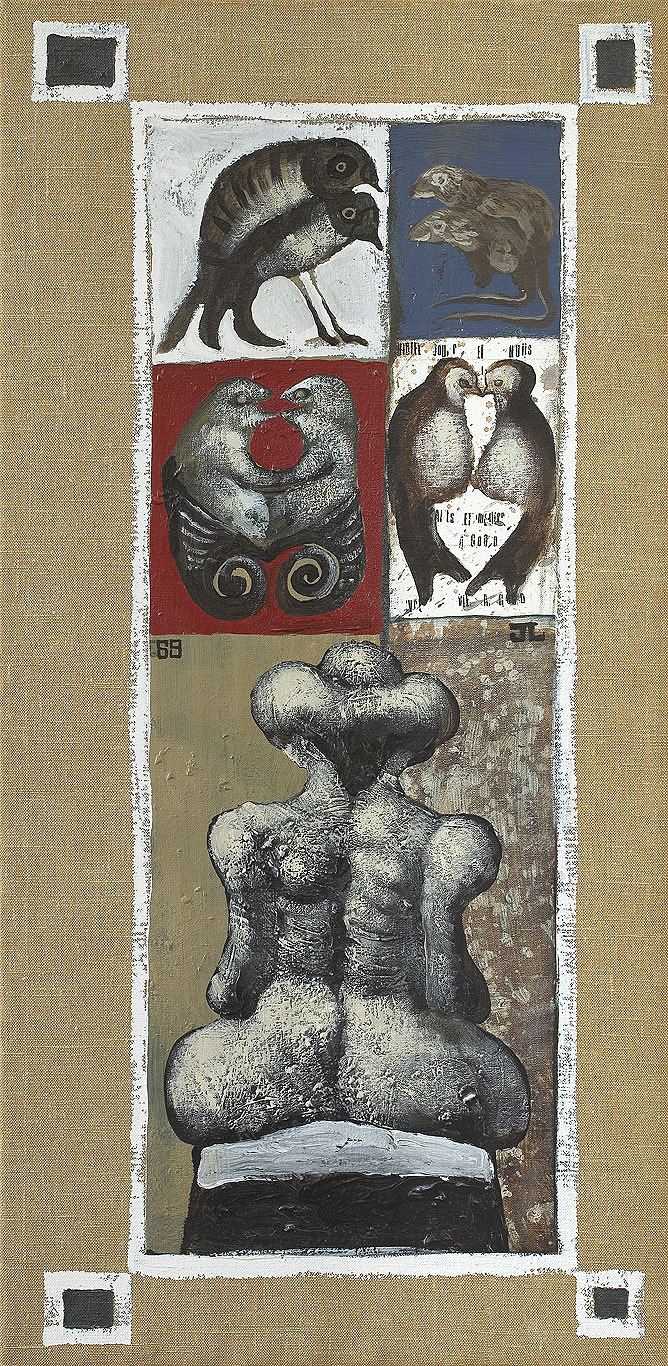 Jan Lebenstein (Brześć Litewski 1930 - Kraków 1999) w latach 1948-1954 studiował malarstwo w ASP w Warszawie pod kierunkiem prof. Eugeniusza Eibischa i Artura Nachta-Samborskiego. W 1955 wziął udział w wystawie w warszawskim Arsenale. Zaprzyjaźniony w czasie studiów z Mironem Białoszewskim, swą pierwszą wystawę indywidualną pokazał w 1956 w Teatrze na Tarczyńskiej. W 1959 zdobył Grand Prix de la Ville de Paris na I Biennale Młodych w Paryżu i w tym roku przeniósł się na stałe do Paryża. Po seriach "figur kreślonych" (na papierze milimetrowym) i "figur hieratycznych" z lat 1955-1958 maluje cykl "figur osiowych" (1958-1962), które wystawia w Paryżu i USA. Równolegle w 1960 zaczyna rysowane "karnety", rodzaj dziennika, który w przyszłości dostarczy motywów wykorzystanych w obrazach. W latach 1964-1965 maluje "Bestiarium", cykl fakturowych, archaizowanych stworów przypominających prehistoryczne wykopaliska. Bezpośrednio po nich wprowadza do swych obrazów postaci ludzkie i fantastyczne, odgrywające sceny ni to mitologiczne, ni to ze snu, często przesycone erotyką. W 1970 projektuje witraże dla Centre du Dialogue w Paryżu. W W 1971 otrzymuje obywatelstwo francuskie 1974 powstają gwasze inspirowane Folwarkiem zwierzęcym George'a Orwella. W latach 1976-1989 tworzy wyłącznie w technice gwaszu i pastelu, podejmując tematykę mitologiczną i zaczerpniętą z Biblii: cykle ilustracji do Księgi Hioba (wyd. 1979) i do Apokalipsy (wyd. 1986) w nowych przekładach Czesława Miłosza. W 1989 powraca do malarstwa olejnego (cykl "Pergamon"). Artysta otrzymał m. in. nagrodę Fundacji im. Alfreda Jurzykowskiego w 1976, Nagrodę Muzeum Archidiecezji Warszawskiej w 1985, Nagrodę im. Jana Cybisa w 1987.