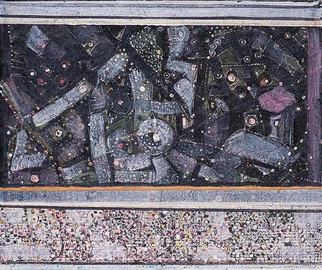 Bogusław Szwacz (Leżajsk 27 III 1912 – Warszawa 24 II 2009) studiował malarstwo na ASP w Krakowie, którą ukończył z wyróżnieniem w 1937. W czasie studiów odbył służbę w Szkole Podchorążych Rezerwy na kresach oraz podróż studyjną do Wiednia. Lata wojny przetrwał we Lwowie, kolejno pod okupacją sowiecką i niemiecką. W 1944 ewakuowany z Niemcami do Krakowa, osiadł w Tyńcu, gdzie powstał cykl pejzażowych akwarel. Po wojnie włączył się w organizowanie życia artystycznego, w 1946 podjął pracę pedagogiczną w krakowskiej ASP. W 1946 wystawiał z Grupą Młodych Plastyków Kantora. W 1947/48 wyjechał na stypendium do Paryża, gdzie przystąpił do grupy „Le Surréalisme Révolutionnaire", współredagował jej dwumiesięcznik. W 1948 przeniósł się do Warszawy, gdzie związał się z Klubem Młodych Artystów i Naukowców. Okres działalności w ruchu awangardy powojennej zamknął udziałem w I Wystawie Sztuki Nowoczesnej w Krakowie na przełomie 1948/49. Od końca 1949 pracował w warszawskiej PWSSP, a po jej połączeniu się z ASP w 1950 rozpoczął wieloletnią karierę pedagogiczną w tej uczelni, trwającą do emerytury w 1982. W latach socrealizmu uczestniczył we wszystkich Ogólnopolskich Wystawach Plastyki (1950, 1951/52, 1952/53, 1954) i w innych oficjalnych wystawach. Jego wystawa indywidualna w marcu 1955 była jedną z pierwszych wystaw sztuki abstrakcyjnej. W tym czasie artysta zaczął formułować własną teorię sztuki, której pozostaje wierny do dziś. Koncepcja Ars-Horme (Sztuki Poruszania Wyobraźni) konkretyzuje się w obrazach, których odmiany określają terminy ars-hormegram, ars-hormegraf i ars-hormegryf. Są to kompozycje budowane z drobnych form, których rytmy i zagęszczenia na płaszczyźnie są dodatkowo akcentowane fakturą i kolorem. Teoria Ars-Horme stała też u podstaw metody dydaktycznej Szwacza, który od lat 60. uczył rysunku na Wydziale Rzeźby. Od końca lat 50. artysta uczestniczył w wielu wystawach ruchu awangardowego, m.in. w II i III Wystawie Sztuki Nowoczesnej w Warszawie (1957 i 1959), „Konfrontacjach“ w Galerii Krzywe Koło, Warszawa 1962 i 1963, I Biennale Form Przestrzennych w Elblągu (1965), sympozjach Złotego Grona w Zielonej Górze (1973, 1976), plenerach w Osiekach (1964, 1976, 1977, 1978, 1984). Oprócz malarstwa i rysunku artysta zajmował się muzyką (grał na skrzypcach), a od lat 80. również poezją (wybór z kilku tysięcy sonetów wydał w 1988 w dwu tomikach).