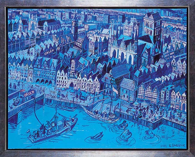 Edward Dwurnik (Radzymin 19 IV 1943 - Warszawa 28 X 2018) studiował malarstwo w ASP w Warszawie (1963-1970), jednak jako swego „mistrza“ wymienia Nikifora. Jego to prace, zobaczone po raz pierwszy w 1965, zainspirowały ówczesnego studenta III roku do narysowania pierwszych prac z cyklu „Podróże autostopem“, które kontynuował w nastepnych latach. W 1972-1978 powstawał cykl „Sportowcy“, w którym portretowane były, dodajmy - kąśliwie, typowe postaci z lat 70. Równolegle od 1975 powstawał cykl „Robotnicy“, który kulminował w okresie „Solidarności“ 1980-1981. Za prace z tego cyklu Dwurnik otrzymał w 1981 Nagrodę Krytyki Artystycznej im. Cypriana Kamila Norwida, natomiast za obrazy z cyklu „Warszawa“ (1981), proroczo zapowiadające stan wojenny - Nagrodę Kulturalną „Solidarności“ podziemnej w 1983. W latach 80. malarstwo Dwurnika przybrało wyraz ekspresyjny i dramatyczny. Powstające w tej dekadzie obrazy miały niejednokrotnie wymowę polityczną, przybierały też kostium historyczny, tak czy inaczej odnoszący się do współczesnych spraw i realiów. Cykl „Droga na Wschód“ (1989-91) upamiętniał ofiary stalinizmu, natomiast cykl „Od Grudnia do Czerwca“ (1990-94) - ofiary stanu wojennego. Zarówno ideowe, jak i czysto malarskie walory tych prac przyniosły artyście ogromne uznanie, zarówno w kraju jak i za granicą. Jego wyrazem była prestiżowa nagroda Fundacji Coutts & Co w Zurychu (1992). W latach 90. powstają cykle będące kontynuacją „Podróży autostopem“: „Niebieskie miasta“ (od 1993) i „Diagonale“ (od 1996), jak również kompozycje nowego typu, jak widoki morskie (cykl „Błękitne“, 1992-93) czy cykl „Wyliczanka“ (1996-99). Artysta wiele wystawia, miał ok. 100 wystaw indywidualnych w Polsce i za granicą, brał też udział w licznych wystawach i festiwalach krajowych i międzynarodowych, m.in.: X Biennale Sztuki Współczesnej, Menton 1974, Documenta 7, Kassel 1982, 5th Biennale, Sydney 1985, XIX Biennale Sztuki, Sao Paulo 1987; Olimpiada Sztuki, Seul 1988. Równolegle z malarstwem uprawiał rysunek, collage, grafikę warsztatową (litografia, techniki metalowe, kserografia, stemple) i użytkową (ilustracja, plakaty do własnych wystaw indywidualnych).