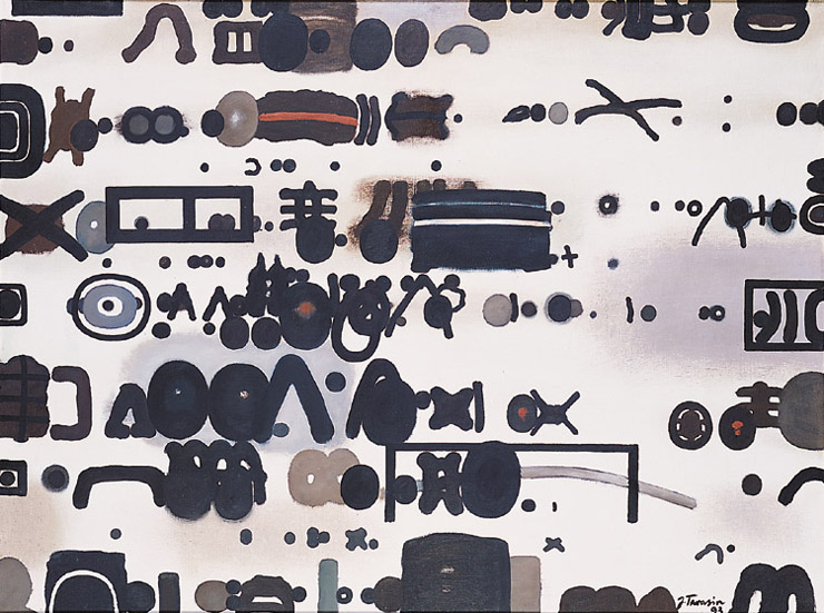 Jan Tarasin (Kalisz 11 IX 1926 - Warszawa 8 VIII 2009) studiował malarstwo w ASP w Krakowie pod kierunkiem prof. Zbigniewa Pronaszki (1946-1951). Jeszcze jako student zadebiutował na I Wystawie Sztuki Nowoczesnej w Krakowie w 1948/49. W połowie lat 50. stworzył cykle litografii: „Nowa Huta i jej mieszkańcy“, 1954, „Dom“, 1955). W pierwszym przeciwstawił się oficjalnemu optymizmowi, w drugim, operując symboliką martwej natury, zawarł treści egzystencjalne i odnoszące do niedawnego dramatu wojny. Po 1956 zaczął malować obrazy niefiguratywne. Układy wyodrębnionych elementów (określanych jako „przedmioty“) umieszczane były przez artystę na płaszczyźnie (cykl „Wnętrze“, 1957) ), lub w aluzyjnej przestrzeni (cykle „Uczta“, 1957, „Brzeg“, 1962-1964, „Przedmioty policzone“, od 1968, „Antykwariat“, 1968). Zasada ta utrzymuje się w jego malarstwie w następnych latach, różnice między okresami twórczości dotyczą sposobu opracowania „przedmiotów“ i ich usytuowania w przestrzeni obrazu lub wobec tła. Od lat 70. „przedmioty“ zmieniają się w graficzne, zwykle czarne znaki na jasnych tłach (cykl „Kolekcja“, od 1971). Tła z kolei bywają iluzyjnie przestrzenne, zróżnicowane walorowo, miękkie. W latach 90. artysta wrócił do kolorystycznego, bardziej malarskiego rozwiązywania zarówno znaków, jak i teł, często ciemnych lub przenikających się z „przedmiotami“ (cykl „Wylęgarnia przedmiotów“, 1992). Tarasin od 1962 jest członkiem „Grupy Krakowskiej“. W 1963-67 uczył na Wydziale Architektury Wnętrz krakowskiej ASP. W 1967 przeniósł się do Warszawy, w 1974 podjął pracę pedagogiczną na Wydziale Malarstwa ASP w Warszawie. W 1987-90 był rektorem tej uczelni. W 1976 otrzymał Nagrodę Krytyki Artystycznej im. Cypriana Kamila Norwida, w 1984 Nagrodę im. Jana Cybisa.; Nagroda na MB Sztuki w San Marino 1965. Równolegle z malarstwem zajmował się rysunkiem i grafiką - do lat 60. litografią, od 1974 serigrafią. W 1974-1981 wydał 8 autorskich „Zeszytów“ z serigrafiami i własnymi tekstami. W 1995 w Galerii Zachęta odbyła się wystawa artysty, której towarzyszył monograficzny katalog.