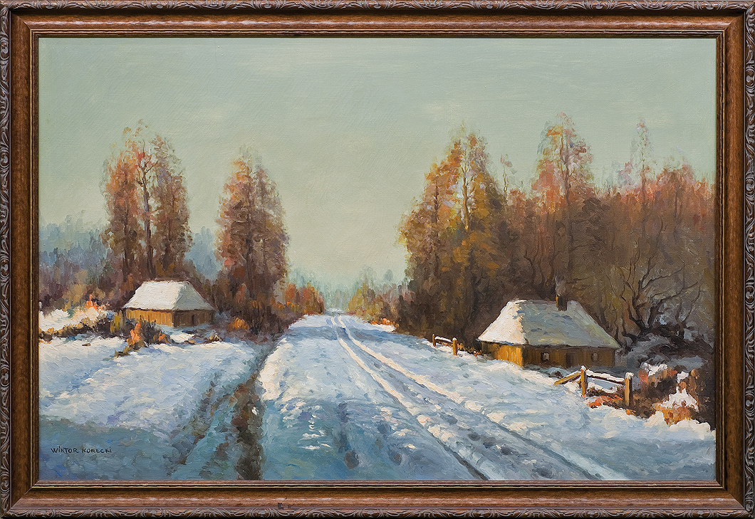 Wiktor Korecki (Kamieniec Podolski 1890 - Komorów k. Warszawy 1980) - malarz pejzażysta - gimnazjum ukończył w Kijowie, tam też studiował w Szkole Rysunkowej Aleksandra Muraszki. Po studiach wrócił do Kamieńca Podolskiego, skąd w roku 1921 wyjechał do Warszawy. Tu miał pracownię na rogu ulic Tamki i Cichej. Niestety zgromadzone tam obrazy spłonęły w czasie powstania 1944 roku. Po powstaniu artysta przebywał w obozie w Pruszkowie skąd trafił do obozu pracy w Lipsku. Do kraju powrócił w roku 1946 i zamieszkał w Komorowie pod Warszawą, a później w Milanówku. Jego nastrojowe krajobrazy emanujące spokojem i pogodą cieszyły się zawsze dużą popularnością. Korecki najczęściej malował pejzaże zimowe z motywem leśnej drogi i strumienia wijącego się wśród śniegów, a obok nich także wiosenne, letnie czy jesienne widoki z Mazowsza.