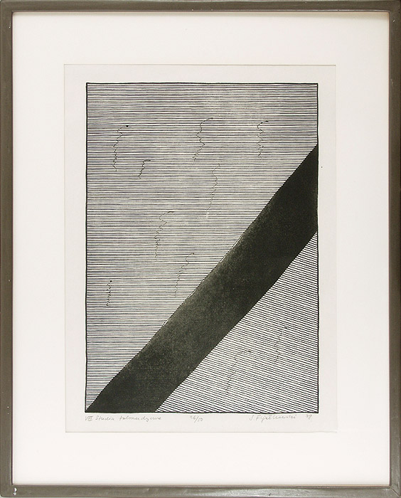 Stanisław Fijałkowski (Zdołbunow na Wołyniu 1922 - Łódź 2020) w latach 1944-1945 przebywał na robotach przymusowych w Królewcu. W latach 1946- 1951 studiował w Państwowej Wyższej Szkole Sztuk Plastycznych w Łodzi pod kierunkiem Władysława Strzemińskiego, Stefana Wegnera i Ludwika Tyrowicza, u którego uzyskał dyplom. W latach 1947-1993 był pedagogiem w macierzystej uczelni, od 1983 profesorem. Pełnił funkcje prorektora i dziekana Wydziału Grafiki. Wykładał też za granicą: w Mons (1978, 1982), Giessen (1989-1990), Marburgu (1990). Jest wiceprezydentem Międzynarodowego Stowarzyszenia Drzeworytników XYLON w Szwajcarii i przewodniczącym Polskiej Sekcji tej organizacji. Należy do zagranicznych Akademii nauk i sztuk w Salzburgu i Brukseli. Jest laureatem Nagrody Krytyki Artystycznej im. Cypriana Norwida 1971, Nagrody im. Jana Cybisa 1990 i wielu innych wyróżnień. Jako pierwszy w Polsce przetłumaczył teksty Wasyla Kandinskiego („Punkt i linia a płaszczyzna” i „O duchowości w sztuce”), oba wydane drukiem, oraz Kazimierza Malewicza „Świat bezprzedmiotowy”. Malarstwo Fijałkowskiego bazuje na skromnym zasobie abstrakcyjnych znaków i ograniczonej gamie barwnej. Kompozycje, w większości sugerujące ujęcia pejzażowe czy szerzej – przestrzenne, budowane są jakby pojedynczymi dotknięciami pędzla. Każdy szczegół nabiera ważności, śledzi się każdy niuans barwy czy faktury. Charakterystyczne kształty i motywy powtarzają się w różnych konfiguracjach w pracach artysty niczym wyrazy, z których układa za każdym razem inną opowieść. Obrazy noszą zazwyczaj poetyckie tytuły, często wpadające w tony groteskowe czy surealistyczne. Cechy te składają się na niezwykłe, intrygujące, autonomiczne zjawisko artystyczne. Malarstwu Fijałkowskiego od początku lat 60. towarzyszy czarno-biała grafika, głównie linoryt i drzeworyt, sporadycznie litografia.