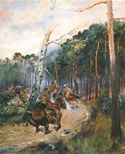 Jerzy Kossak (Kraków 1886 - Kraków 1955)- syn Wojciecha, wnuk Juliusza Kossaków - od wczesnego dzieciństwa malował pod kierunkiem ojca i dziadka. Kontynuator i naśladowca ich sztuki tworzył sceny batalistyczne, historyczne i rodzajowe z wszechobecnym motywem konia. Malował obrazy z powstania listopadowego, wojen napoleońskich oraz wiele scen z wojny 1920 roku. Najbardziej znaną jego kompozycją tego rodzaju był Cud nad Wisłą. Malował też liczne Pogonie i Pościgi ułanów za kozakami, Napady wilków, Polowania i Wesela. Tematyka tych prac sprawia, że stale cieszą się zainteresowaniem zbieraczy i publiczności, zawsze tłumnie odwiedzającej wystawy malarstwa Kossaków.