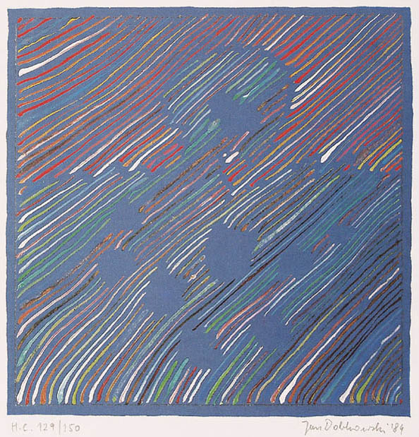 Jan Dobkowski (Łomża 1942, mieszka w Warszawie) studiował w latach 1962-1968 na Wydziale Malarstwa warszawskiej ASP pod kierunkiem prof. Juliusza Studnickiego i Jana Cybisa. Będąc jeszcze na studiach, w 1966, utworzył duet artystyczny, w którym jego partnerem był Jerzy (Jurry) Zieliński. Ich pierwsza wspólna wystawa pn. Neo-Neo-Neo odbyła się w Warszawie w 1967. Wystawiali wspólnie do 1970. W 1968 powstały pierwsze zielono-czerwone obrazy Dobkowskiego (używającego w tym czasie pseudonimu Dobson). W pracach tych, operujących giętkimi, falistymi liniami, w których upatrywano wpływów secesji, artysta używał sposobów rodem z op-artu dla wywołania złudzeń optycznych (wirowanie, mżenie, pozorny ruch form). Równolegle z obrazami tworzył też formy z płyt i folii do montowania w przestrzeni. Złoty medal na Sympozjum Złotego Grona w Zielonej Górze w 1971 i blisko roczny pobyt w USA na stypendium Fundacji Kościuszkowskiej w 1972 to kolejne etapy pełnej sukcesów kariery malarza. Wyraźną zmianę nastroju i wymowy jego prac przyniosły wydarzenia 1980-1981 roku, zwłaszcza wprowadzenie stanu wojennego. Monochromatyczne, ciemne płótna znaczył wtedy nikłymi, wiotkimi liniami rysunku. Najczęstszym motywem były patriotyczne i religijne symbole, dopowiadane tytułami nawiązującymi do realiów czasu. Kolejna radykalna zmiana nastąpiła ok. 1990. Symbolicznym zwiastunem nowego okresu stał się olbrzymi, radosny, eksplodujący bogactwem barw, kształtów i ruchu obraz ...a życie sobie płynie... (394 x 588 cm) z 1990-1991. Podobne cechy formalne charakteryzują twórczość artysty w całej dekadzie lat 90. Równolegle z malarstwem Dobkowski pracuje nad rysunkiem, będącym bardzo ważnym dopełnieniem jego twórczości.