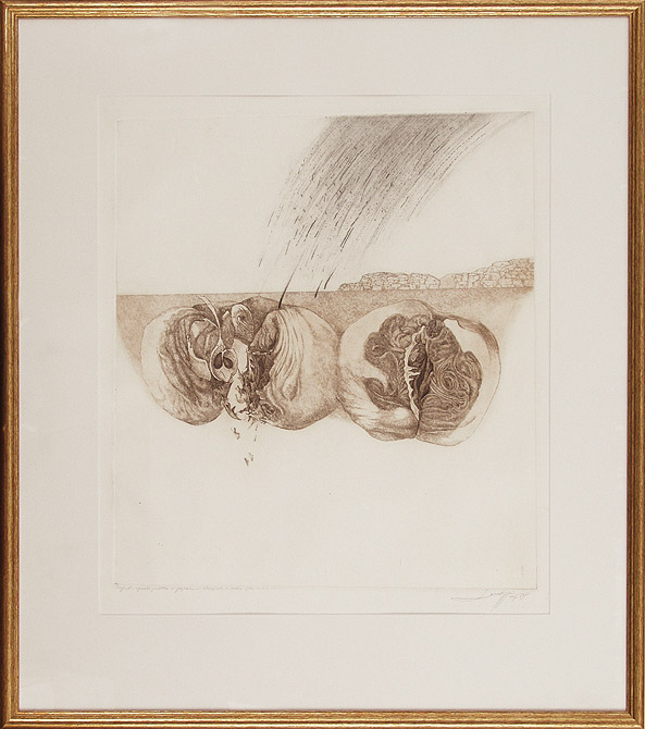 Leszek Rózga (Zgierz 1924 - Łódź 2015) - artysta grafik. W latach 1940-1945 przebywał na robotach w Niemczech, gdzie po zakończeniu wojny pracował w teatrze amatorskim i uczył się prywatnie malarstwa (1945-1947). Studiował w Państwowej Wyższej Szkole Sztuk Plastycznych w Łodzi (1948-1951) i na Wydziale Grafiki Propagandowej w Katowicach - filii ASP w Krakowie, gdzie obronił dyplom w 1954. W latach 1967-1994 był wykładowcą (od 1979 profesorem) w uczelni łódzkiej, gdzie stworzył szkołę metaforycznej, ekspresyjnej sztuki graficznej. Brał udział w licznych wystawach w kraju i za granicą, zdobywając często nagrody. Był również laureatem wielu nagród państwowych, resortowych, regionalnych itp., jak: Nagrody Ministra Kultury i Sztuki I st. 1981, 1986, 1994, Nagroda Woj. Łódzkiego 1972, Nagroda Miasta Łodzi 1985. Działał w ZPAP, był m. in. członkiem Rady Artystycznej Zarządu Głównego 1974-1976. Początkowo zajmował się głównie malarstwem, rysunkiem i monotypią, tworząc nastrojowe widoki miejskie. Od 1960 skupił się na grafice warsztatowej (głównie w technikach metalowych). W latach 70. wprowadzał do swych kompozycji werystycznie odwzorowane rośliny i owoce, inskrypcje, cytaty ze sztuki klasycznej.