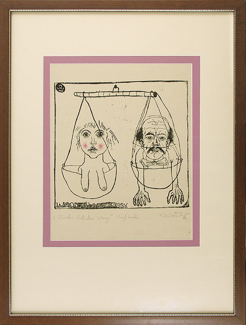 linoryt, kredka, papier beżowy