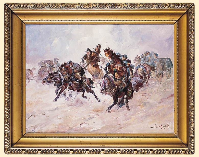 Stanisław Kaczor-Batowski (Lwów 1866 - Lwów 1946) - studia artystyczne rozpoczął w krakowskiej Szkole Sztuk Pięknych pod kierunkiem Władysława Łuszczkiewicza i Floriana Cynka. Później kształcił się w Akademii w Wiedniu, a w l. 1887-1889 także w Akademii w Monachium pod kierunkiem A.Liezen-Mayera. Podróżował do Włoch, Hiszpanii, Maroka i na Krym; był także w Stanach Zjednoczonych. Stale mieszkał we Lwowie, gdzie w latach 1903-1914 prowadził własną szkołę malarstwa. Był współzałożycielem lwowskiego Stowarzyszenia Artystów „Młoda Polska”. Znany jest przede wszystkim jako batalista, twórca takich płócien, jak Atak husarii pod Chocimiem (Muzeum Wojska Polskiego w Warszawie), Pułaski pod Savannach, Bitwa pod Zadwórzem(Muzeum Wojska Polskiego w Warszawie). Malował także pejzaże, portrety i obrazy religijne. Zajmował się także ilustratorstwem, m.in. wykonał cykle kartonów i ilustracji do utworów J. Słowackiego, powieści H. Sienkiewicza i E. Orzeszkowej. Projektował witraże (np. do katedry łacińskiej we Lwowie), zajmował się malarstwem ściennym, współpracując m.in. przy dekoracji lwowskiego teatru.
