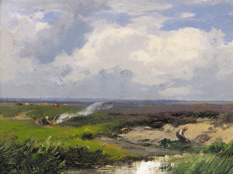 Roman Kochanowski (Kraków 1857 - Freising k. Monachium 1945) - malarz i grafik - był jednym z polskich artystów osiadłych i stałe działających w Monachium. Studia malarskie rozpoczął w Krakowie; początkowo w prywatnej pracowni Maksymiliana Cercha, a w latach 1873- 1875 w Szkole Sztuk Pięknych u Władysława Łuszczkiewicza i pejzażysty Henryka Grabińskiego. Przez następne dwa lata uczył się jeszcze na wydziale pejzażu w Akademii wiedeńskiej. W 1881 przeniósł się do Monachium, gdzie miał własną pracownię, a niebawem założył rodzinę. Często jednak przyjeżdżał do Krakowa, bywał w Poznańskiem, odbył podróż po Galicji i Podolu, rysując krajobrazy i widoki miast, które weszły następnie do albumu wydanego w Wiedniu w roku 1898. Artysta należał do monachijskiego Kunstvereinu, brał udział w wielu wystawach w Niemczech, w Wiedniu, w Londynie; swoje prace przesyłał też na pokazy krajowe. Malował przede wszystkim pejzaże a tylko z rzadka kwiaty i portrety. Stałym i ulubionym motywem jego obrazów był polski, podkrakowski krajobraz z wplecionymi weń postaciami ludzi. Obrazy artysty, malowane często na niewielkich deseczkach, pozbawione warstwy anegdotycznej odznaczają się niecodziennymi walorami malarskimi, harmonią koloru i pełnym liryzmu nastrojem. Zauważane i nagradzane na licznych wystawach były też wysoko cenione na rynku sztuki. W roku 1892, po wystawie w Wiedniu, jeden z obrazów Kochanowskiego zakupił do swoich zbiorów cesarz Franciszek Józef; dwa inne nabyli członkowie cesarskiej rodziny. Wielbicielem jego malarstwa był Karol Józef Luitpold, książę regent Bawarii. Wielka wrażliwość artysty na krajobraz i przyrodę widoczna jest także w jego rysunkach i akwafortach.