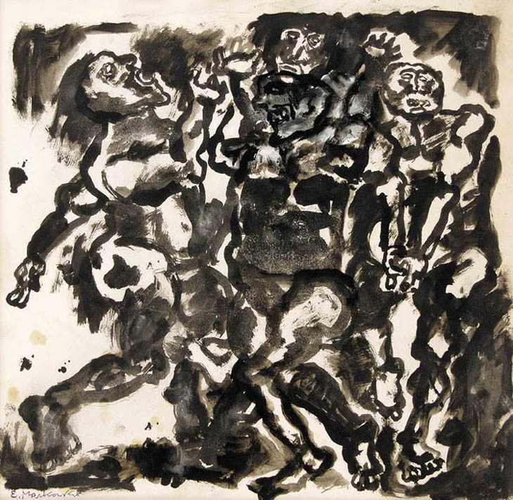 Eugeniusz Markowski (Warszawa 8 XI 1912 - Warszawa 24 II 2007) studiował w warszawskiej ASP, dyplom u prof. Tadeusza Pruszkowskiego uzyskał w 1939. Brał udział w kampanii wrześniowej i obronie Warszawy. W latach 1940-1950 przebywał we Włoszech, gdzie związał się z grupą Libera Associazione Arti Figurative i z Art Club w Rzymie. Zajmował się też projektowaniem scenografii dla rzymskiego Teatro delle Arti. Był dziennikarzem i dyplomatą we Włoszech i Kanadzie (1945-1955). Po powrocie do kraju był dyrektorem Biura Współpracy Kulturalnej z Zagranicą Ministerstwa Kultury i Sztuki (1960-1969), następnie wykładowcą i profesorem ASP w Warszawie (1969-1984). Współ-pracował jako scenograf z Operą Gdańską i teatrami warszawskimi. W 1963 reprezentował Polskę na Biennale w Sao Paulo, miał kilka wystaw indywidualnych. Jego ekspresyjny styl malowania, bezpośredniość i pewna rubaszność figuratywnych przedstawień walk i zmagań spowodowały, że w latach 80. uznano go za prekursora „nowodzikich".