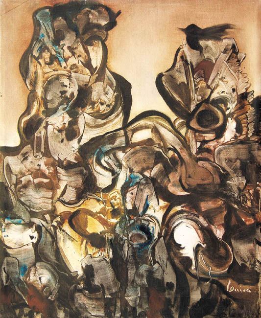 Alfred Lenica (Pabianice 1899 - Warszawa 1977) uczył się prywatnie rysunku i malarstwa w pracowniach Artura Hannytkiewicza i Piotra Kubowicza w Poznaniu (1925-1928). W latach 30. malował obrazy figuratywne, nawiązujące w stylistyce do kubizmu. Nieco później uległ wpływom surrealizmu, który, pomijając lata socrealizmu, stanie się dlań najpoważniejszym obszarem poszukiwań malarskich. Od połowy lat 40. utrzymywał stałe kontakty z kręgiem „Grupy Krakowskiej“, przyjaźnił się z Jerzym Kujawskim. Po przeniesieniu się do Poznania, w 1947 został współzałożycielem awangardowej grupy „4F+R“ (farba, forma, fantastyka, faktura + realizm). Jest autorem pierwszego polskiego obrazu taszystowskiego (Farby w ruchu, 1949, tempera). W okresie socrealizmu włączył się w nurt oficjalnej sztuki, pracując jednocześnie jako organizator życia artystycznego, prezes Okręgu Poznańskiego ZPAP (1948-1950) i jednocześnie kierownik Pracowni Sztuk Plastycznych tamże. W końcu lat 50. przeniósł się do Warszawy i również tu do 1969 pełnił kierownicze funkcje w ZPAP. W drugiej poł. lat 50. ponownie - po eksperymentach z lat 40. - uprawiał informel, malując chętnie techniką drippingu. Około 1958 wypracował indywidualny, charakterystyczny dlań styl wirujących, kolorowych, niekiedy kaligraficznie opracowanych form, które dynamicznie wypełniały pola obrazów. Tworzył je techniką zbliżoną do surrealistycznej dekalkomanii. Styl ten stał się znakiem rozpoznawczym artysty do końca życia. W swych obrazach nie unikał kształtów nawiązujących do form naturalnych (jego malarstwo nazywano „biologicznym“), a w latach 70. niekiedy włączał do kompozycji motywy figuralne. Wystawa retrospektywna artysty odbyła się w Galerii Zachęta w Warszawie w 1974.