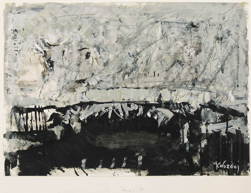 Aleksander Kobzdej (Olesko na Ukrainie 12 IX 1920 - Warszawa 25 IX 1972) od wczesnego dzieciństwa mieszkał we Lwowie, gdzie w 1939 zdał maturę. Równolegle z nauką w szkole średniej uczył się prywatnie rysunku i rzeźby. Jesienią 1939 rozpoczął studia architektoniczne na Politechnice Lwowskiej i jednocześnie zaczął malować pod okiem Władysława Lama. Pod obiema okupacjami, sowiecką i hitlerowską, podejmował prace zarobkowe, kontynuując w miarę możności studia. W 1944 został wywieziony na roboty przymusowe do Wiednia, skąd uciekł do Jugosławii. W 1945 wrócił do kraju. Krótko studiował w ASP w Krakowie u Eugeniusza Eibischa, by już pod koniec 1945 objąć stanowisko asystenta swego dawnego nauczyciela, Władysława Lama, na Wydziale Architektury Politechniki Gdańskiej. Pracując ukończył politechnikę z dyplomem inżyniera i od 1947 zaczął uczyć w PWSSP w Sopocie. Pracował tam do 1951, kiedy to przeniósł się do ASP w Warszawie, gdzie nauczał aż do śmierci. W latach 40. ulegał w swych próbach malarskich wpływom koloryzmu, kierunku triumfującego zarówno w Akademii krakowskiej, gdzie zaczynał studia, jak i w „szkole sopockiej“, w której sam uczył. Koloryzm Kobzdeja był jednakże poddany dyscyplinie skupionej, syntetycznej formy o rodowodzie sięgającym kubizmu i ekspresjonizmu. W pierwszej połowie lat 50. Kobzdej należał do koryfeuszy socrealizmu. Na ile artysta nie unikał, nawet w tym czasie, ironicznej refleksji, świadczy dyptyk złożony z obrazów Podaj cegłę i Ceglarki, w którym skonfrontował postulatywną i rzeczywistą stronę trudu codziennej pracy. W latach 50. rozwinął też swój talent rysownika, tworząc cykle reportażowych notatek z podróży do Chin i Wietnamu. Od 1956 radykalnie zmienił styl, doświadczając odtąd rozmaitych odmian informelu i malarstwa materii. Eksperymentując z fakturą i przestrzenią doszedł do swego głównego motywu, m stał się wielki cykl „Szczelin“, tworzonych od 1966. Ich syntezą stały się obiekty malarskie zwane „Hors cadre“.