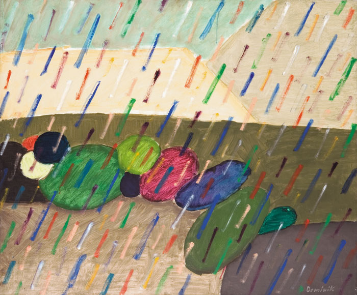 Tadeusz Dominik (Szymanów 14 I 1928 - Warszawa 20 V 2014) studiował na Wydziale Malarstwa ASP w Warszawie pod kierunkiem prof. J.Cybisa (1946-51, dyplom 1953). Od 1951 był pedagogiem na macierzystym Wydziale, początkowo jako asystent Cybisa. Od 1965 prowadził własną pracownię, w 1979 otrzymał tytuł profesora. W 1990 przeszedł na emeryturę. W czasie studiów oddziałały nań - za pośrednictwem osobowości i sztuki Cybisa - idee polskiego koloryzmu, które następnie twórczo i samodzielnie kontynuował. Początkowo tworzył obrazy figuratywne. Debiutował na słynnej wystawie w warszawskim Arsenale w 1955, gdzie zdobył nagrodę. W tym okresie obok malarstwa uprawiał drzeworyt, operujący szerokimi płaszczyznami bieli i czerni (drzeworyty wystawiał m.in. na Biennale w Wenecji w 1956). W drugiej poł. lat 50. zaczął malować obrazy abstrakcyjne, początkowo utrzymane w ekspresyjnej i spontanicznej stylistyce malarstwa informel. W latach 60. wzbogacił swe prace o efekty fakturowe. Niezmienną inspiracją była dla malarza natura, bogactwo i kolorystyka jej form. Pozostał jej wierny do dziś, poddając zmianom sam sposób malowania. Stopniowo rozjaśniał i wygładzał swe kompozycje, wprowadzając efekty dekoracyjne, jak rytmiczne powtórzenia form czy rodzaj malowanych „rastrów“, regularnie znaczących fragmenty kompozycji. Wśród wielu nagród otrzymał m.in. laur „Złotego Grona“ w Zielonej Górze w 1963, Grand Prix Festiwalu Polskiego Malarstwa Współczesnego w Szczecinie w 1968, nagrodę im. George’a Rowney’a w Londynie w 1973 i Nagrodę im. Jana Cybisa w Warszawie w 1973. Równolegle z malarstwem zajmował się gobelinem, ceramiką, również grafiką komputerową.