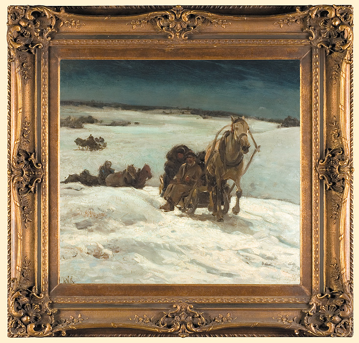 Alfred Wierusz-Kowalski (Suwałki 1849 – Monachium 1915) - jeden z najwybitniejszych polskich malarzy tzw. szkoły monachijskiej był, obok Józefa Brandta i Władysława Czachórskiego, także najpopularniejszym z polskich artystów osiadłych i stale działających w Monachium. Zamieszkał tam w roku 1873, już po studiach w Warszawie i w Dreźnie. Przez rok uczył się jeszcze w monachijskiej Akademii Sztuk Pięknych pod kierunkiem Alexandra Wagnera, a następnie przeniósł się do prywatnej pracowni Brandta. Uznanie krytyki i publiczności zdobył wcześnie; jego obrazy, odznaczane medalami na wystawach były rozchwytywane przez kolekcjonerów i niemieckich handlarzy. W roku 1890 został honorowym profesorem Akademii monachijskiej. Malował sceny rodzajowe i rodzajowo-historyczne z motywami jeźdźców, rycerzy, myśliwych, koni, wilków i śniegów. Po podróży do Afryki w roku 1903 podejmował też tematy orientalne. W polskich zbiorach muzealnych znalazło się stosunkowo niewiele prac artysty – jego obrazy sprzedawane głównie na rynku niemieckim w większej liczbie trafiały do kolekcji prywatnych, głównie w Niemczech i Stanach Zjednoczonych. Obecne często pojawiają się i na polskim rynku sztuki, zawsze budząc zainteresowanie kolekcjonerów.