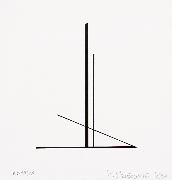 Henryk Stażewski (Warszawa 9 I 1894 - Warszawa 10 VI 1988) studiował w Szkole Sztuk Pięknych w Warszawie w latach 1913-1920. W początkach kariery malował martwe natury. Przejściowo wystawiał z ugrupowaniem „Formiści” (1922). Wziął też udział w Wystawie Nowej Sztuki w Wilnie w 1923. O tego czasu tworzył pod wpływem konstruktywizmu. Obok kompozycji malarskich trudnił się grafiką książkową, projektował wnętrza, sprzęty, a także scenografie – były to w większości prace teoretyczne i studyjne. Polskie i międzyna-rodowe ugrupowania awangardy, z którymi wystawiał i współpracował jako publicysta, to kolejno: „Blok” (1924-1926), „Praesens” (1926-1930), „Cercle et Carré” (1929-1931), „Abstraction-Création” (1931-1939), „a. r.” (1932-1939). Należał też do Koła Artystów Grafików Reklamowych (1933-1939). W 1930 był współorganizatorem zbiórki dzieł artystów międzynarodowej awangardy przeznaczonych dla muzeum łódzkiego (obecnie w Muzeum Sztuki w Łodzi). Po II wojnie mieszkał i działał w Warszawie. W latach 40. i 50. podejmował próby dostosowania się do postulatów sztuki figuratywnej. Z tego okresu pochodzą rysunkowe i malarskie kompozycje o tematyce pracy, budowy, a także projekty monumentalne. Po 1956, uznawany powszechnie za patrona polskiej awangardy, uprawiał już wyłącznie abstrakcję o konstruktywistycznym rodowodzie. Tworzył cykle prac, będących studiami płaszczyzn, linii, kolorów w różnych układach względem siebie. Przy pozorach chłodnej perfekcji umiał nasycić je emocją bezpośredniego dotknięcia, śladu ręki. Obok malarstwa i form pochodnych, jak collages, reliefy, multiple, tworzył formy przestrzenne i grafikę (autoryzował serigraficzne repliki swoich prac). Był laureatem wielu nagród i odznaczeń krajowych i zagranicznych, w tym Nagrody Herdera, Wiedeń 1972.