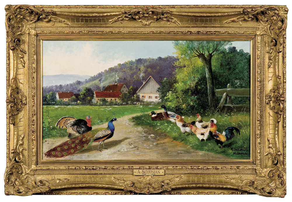 Alfred Schönian (Frankfurt nad Odrą 1856 - Monachium po 1936) – niemiecki pejzażysta i animalista; studia artystyczne rozpoczął w Akademii w Lipsku u rzeźbiarza Melchiora Antona. Od 1877 kształcił się w Akademii w Monachium pod kierunkiem Gyuli Benczura i Johanna Leonharda Raaba. Po studiach pozostał na stałe w Monachium. Malował krajobrazy (m.in. Widoki znad Chiemsee, Wiejska droga), martwe natury, sceny rodzajowe, nieliczne portrety, a także baśniowe motywy z gnomami, krasnoludami (Gnom i żaba). Najbardziej znane były jednak jego kompozycje animalistyczne (Krowy nad wodą, Koty w stajni, Konie), w tym szczególnie obrazy z domowym ptactwem; pawiami, indykami, kaczkami, kurami przedstawianymi na pejzażowym tle bądź wiejskiego podwórka, bądź pałacowego parku lub dziedzińca (Walka kogutów, Pawie w parku, Kaczki i kury itp.). Prace te szerzej popularyzowane były przez barwne pocztówki. Artysta zajmował się także ilustratorstwem