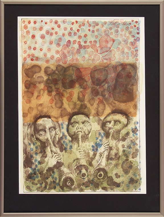 Jan Lebenstein (Brześć Litewski 1930 - Kraków 1999) w latach 1948-1954 studiował malarstwo w ASP w Warszawie pod kierunkiem prof. Eugeniusza Eibischa i Artura Nachta-Samborskiego. W 1955 wziął udział w wystawie w warszawskim Arsenale. Zaprzyjaźniony w czasie studiów z Mironem Białoszewskim, swą pierwszą wystawę indywidualną pokazał w 1956 w Teatrze na Tarczyńskiej. W 1959 zdobył Grand Prix de la Ville de Paris na I Biennale Młodych w Paryżu i w tym roku przeniósł się na stałe do Paryża. Po seriach "figur kreślonych" (na papierze milimetrowym) i "figur hieratycznych" z lat 1955-1958 maluje cykl "figur osiowych" (1958-1962), które wystawia w Paryżu i USA. Równolegle w 1960 zaczyna rysowane "karnety", rodzaj dziennika, który w przyszłości dostarczy motywów wykorzystanych w obrazach. W latach 1964-1965 maluje "Bestiarium", cykl fakturowych, archaizowanych stworów przypominających prehistoryczne wykopaliska. Bezpośrednio po nich wprowadza do swych obrazów postaci ludzkie i fantastyczne, odgrywające sceny ni to mitologiczne, ni to ze snu, często przesycone erotyką. W 1970 projektuje witraże dla Centre du Dialogue w Paryżu. W W 1971 otrzymuje obywatelstwo francuskie 1974 powstają gwasze inspirowane Folwarkiem zwierzęcym George'a Orwella. W latach 1976-1989 tworzy wyłącznie w technice gwaszu i pastelu, podejmując tematykę mitologiczną i zaczerpniętą z Biblii: cykle ilustracji do Księgi Hioba (wyd. 1979) i do Apokalipsy (wyd. 1986) w nowych przekładach Czesława Miłosza. W 1989 powraca do malarstwa olejnego (cykl "Pergamon"). Artysta otrzymał m. in. nagrodę Fundacji im. Alfreda Jurzykowskiego w 1976, Nagrodę Muzeum Archidiecezji Warszawskiej w 1985, Nagrodę im. Jana Cybisa w 1987.