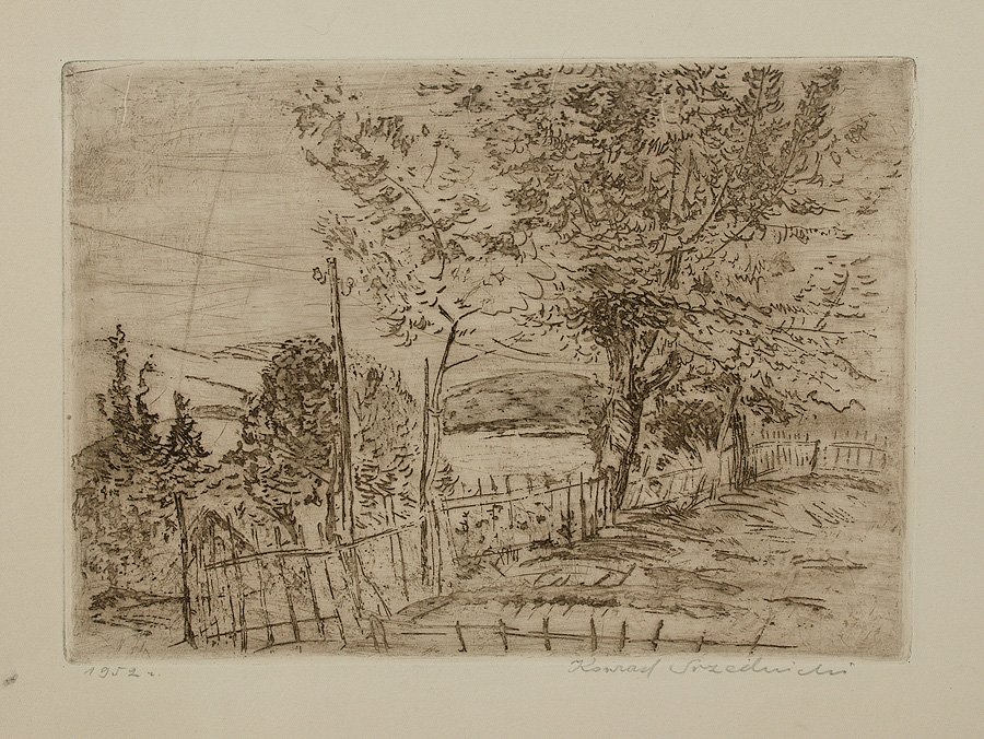 Konrad Srzednicki (Wysokie Mazowieckie 1 XI 1894 – Kraków 8 IV 1993) studiował w prywatnej Szkole Malarstwa i Rysunku Konrada Krzyżanowskiego (1921-1924), następnie w Szkole Sztuk Pięknych w Warszawie (1924-1930, dyplom 1936). W latach 1928-1939 pracował w Katedrze Grafiki Artystycznej macierzystej uczelni. W 1939 został powołany na profesora grafiki w ASP w Krakowie, gdzie – poza latami II wojny światowej – pracował do 1965. Pełnił w tej uczelni funkcje kierownika Katedry Grafiki (1945-1950), rektora (1951-1952), dziekana Wydziału Grafiki (1961-1964). Był członkiem Stowarzyszenia „Ryt” (1929-1939) i grupy „9 grafików” (1952-1960). W 1965 został członkiem honorowym Akademii Sztuk Pięknych we Florencji. Był też członkiem Komitetu Organizacyjnego Międzynarodowego Biennale Grafiki w Krakowie, w latach 1966-1970 jego sekretarzem generalnym. Zdobył liczne nagrody, m. in. na Międzynarodowej Wystawie „Sztuka i Technika”, Paryż 1937, na Światowej Wystawie Grafiki, Londyn 1962, na I Międzynarodowym Biennale Grafiki, Kraków 1966, złoty medal na III Międzynarodowym Salonie Sztuk Plastycznych, Victoria 1968 (Brazylia). Zajmował się malarstwem i grafiką warsztatową (litografia, techniki metalowe, rzadziej drzeworyt). Jego kompozycje, głównie w technikach metalowych, bazowały na doskonałym warsztacie. Artysta chętnie stosował duże formaty i kolor. Figuralne sceny rozgrywają się w odrealnionym świecie idylli, często nawiązują do mitów śródziemnomorskich i dziedzictwa kulturowego świata antycznego.
