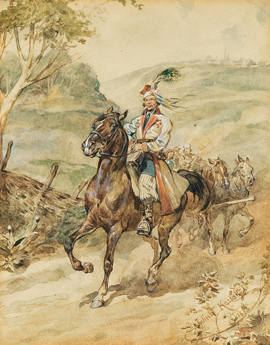 Juliusz Kossak (Wiśnicz 1824 - Kraków 1899) - malarz i ilustrator - był jednym z najpopularniejszych artystów polskich 2. połowy XIX wieku. Naukę rysunku i malarstwa rozpoczął we lwowskiej pracowni Jana Maszkowskiego; później wiele rysował z natury odwiedzając majątki szlacheckie na Ukrainie, Podolu i Wołyniu. W roku 1852 był w Wiedniu, na Węgrzech i w Petersburgu, a następnie zamieszkał na stałe w Warszawie. Lata 1856-1860 spędził w Paryżu, gdzie przyjaźnił się z Horacem Vernetem. Powróciwszy do Warszawy w latach 1862-1868 był kierownikiem artystycznym „Tygodnika Ilustrowanego”. W roku 1869 przeniósł się na stałe do Krakowa, skąd wyjeżdżał jeszcze do Monachium, by malować w atelier batalisty Franza Adama. Kossak był przede wszystkim znakomitym akwarelistą; rzadziej posługiwał się techniką olejną. Malował obrazy historyczne i batalistyczne, sceny rodzajowe ilustrujące życie i tradycje dworu szlacheckiego oraz obyczaje polskiego ludu. Ale prawdziwymi bohaterami jego obrazów były konie, których ruch, temperament, charakter i indywidualność potrafił po mistrzowsku przedstawić. Był także autorem wielu ilustracji do czasopism i książek, trafiającym bezbłędnie tak w klimat utworów literackich, jak i w tęsknoty i potrzeby odbiorców - czytelników Pieśni o ziemi naszej Wincentego Pola, Trylogii Henryka Sienkiewicza, Pana Tadeusza i poematów Adama Mickiewicza.