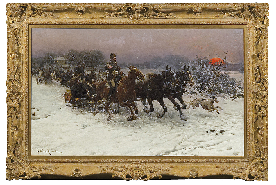 Alfred Wierusz-Kowalski (Suwałki 1849 – Monachium 1915) - jeden z najwybitniejszych polskich malarzy tzw. szkoły monachijskiej był, obok Józefa Brandta i Władysława Czachórskiego, także najpopularniejszym z polskich artystów osiadłych i stale działających w Monachium. Zamieszkał tam w roku 1873, już po studiach w Warszawie i w Dreźnie. Przez rok uczył się jeszcze w monachijskiej Akademii Sztuk Pięknych pod kierunkiem Alexandra Wagnera, a następnie przeniósł się do prywatnej pracowni Brandta. Uznanie krytyki i publiczności zdobył wcześnie; jego obrazy, odznaczane medalami na wystawach były rozchwytywane przez kolekcjonerów i niemieckich handlarzy. W roku 1890 został honorowym profesorem Akademii monachijskiej. Malował sceny rodzajowe i rodzajowo-historyczne z motywami jeźdźców, rycerzy, myśliwych, koni, wilków i śniegów. Po podróży do Afryki w roku 1903 podejmował też tematy orientalne. W polskich zbiorach muzealnych znalazło się stosunkowo niewiele prac artysty – jego obrazy sprzedawane głównie na rynku niemieckim w większej liczbie trafiały do kolekcji prywatnych, głównie w Niemczech i Stanach Zjednoczonych. Obecne często pojawiają się i na polskim rynku sztuki, zawsze budząc zainteresowanie kolekcjonerów.