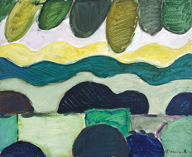Tadeusz Dominik (Szymanów 14 I 1928 - Warszawa 20 V 2014) studiował na Wydziale Malarstwa ASP w Warszawie pod kierunkiem prof. J.Cybisa (1946-51, dyplom 1953). Od 1951 był pedagogiem na macierzystym Wydziale, początkowo jako asystent Cybisa. Od 1965 prowadził własną pracownię, w 1979 otrzymał tytuł profesora. W 1990 przeszedł na emeryturę. W czasie studiów oddziałały nań - za pośrednictwem osobowości i sztuki Cybisa - idee polskiego koloryzmu, które następnie twórczo i samodzielnie kontynuował. Początkowo tworzył obrazy figuratywne. Debiutował na słynnej wystawie w warszawskim Arsenale w 1955, gdzie zdobył nagrodę. W tym okresie obok malarstwa uprawiał drzeworyt, operujący szerokimi płaszczyznami bieli i czerni (drzeworyty wystawiał m.in. na Biennale w Wenecji w 1956). W drugiej poł. lat 50. zaczął malować obrazy abstrakcyjne, początkowo utrzymane w ekspresyjnej i spontanicznej stylistyce malarstwa informel. W latach 60. wzbogacił swe prace o efekty fakturowe. Niezmienną inspiracją była dla malarza natura, bogactwo i kolorystyka jej form. Pozostał jej wierny do dziś, poddając zmianom sam sposób malowania. Stopniowo rozjaśniał i wygładzał swe kompozycje, wprowadzając efekty dekoracyjne, jak rytmiczne powtórzenia form czy rodzaj malowanych „rastrów“, regularnie znaczących fragmenty kompozycji. Wśród wielu nagród otrzymał m.in. laur „Złotego Grona“ w Zielonej Górze w 1963, Grand Prix Festiwalu Polskiego Malarstwa Współczesnego w Szczecinie w 1968, nagrodę im. George’a Rowney’a w Londynie w 1973 i Nagrodę im. Jana Cybisa w Warszawie w 1973. Równolegle z malarstwem zajmował się gobelinem, ceramiką, również grafiką komputerową.