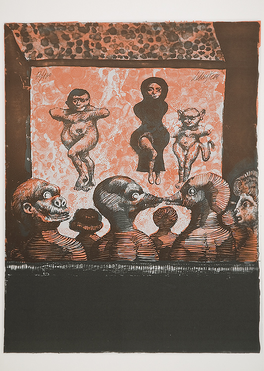 Jan Lebenstein (Brześć Litewski 1930 - Kraków 1999) w latach 1948-1954 studiował malarstwo w ASP w Warszawie pod kierunkiem prof. Eugeniusza Eibischa i Artura Nachta-Samborskiego. W 1955 wziął udział w wystawie w warszawskim Arsenale. Zaprzyjaźniony w czasie studiów z Mironem Białoszewskim, swą pierwszą wystawę indywidualną pokazał w 1956 w Teatrze na Tarczyńskiej. W 1959 zdobył Grand Prix de la Ville de Paris na I Biennale Młodych w Paryżu i w tym roku przeniósł się na stałe do Paryża. Po seriach "figur kreślonych" (na papierze milimetrowym) i "figur hieratycznych" z lat 1955-1958 maluje cykl "figur osiowych" (1958-1962), które wystawia w Paryżu i USA. Równolegle w 1960 zaczyna rysowane "karnety", rodzaj dziennika, który w przyszłości dostarczy motywów wykorzystanych w obrazach. W latach 1964-1965 maluje "Bestiarium", cykl fakturowych, archaizowanych stworów przypominających prehistoryczne wykopaliska. Bezpośrednio po nich wprowadza do swych obrazów postaci ludzkie i fantastyczne, odgrywające sceny ni to mitologiczne, ni to ze snu, często przesycone erotyką. W 1970 projektuje witraże dla Centre du Dialogue w Paryżu. W W 1971 otrzymuje obywatelstwo francuskie 1974 powstają gwasze inspirowane Folwarkiem zwierzęcym George'a Orwella. W latach 1976-1989 tworzy wyłącznie w technice gwaszu i pastelu, podejmując tematykę mitologiczną i zaczerpniętą z Biblii: cykle ilustracji do Księgi Hioba (wyd. 1979) i do Apokalipsy (wyd. 1986) w nowych przekładach Czesława Miłosza. W 1989 powraca do malarstwa olejnego (cykl "Pergamon"). Artysta otrzymał m. in. nagrodę Fundacji im. Alfreda Jurzykowskiego w 1976, Nagrodę Muzeum Archidiecezji Warszawskiej w 1985, Nagrodę im. Jana Cybisa w 1987.