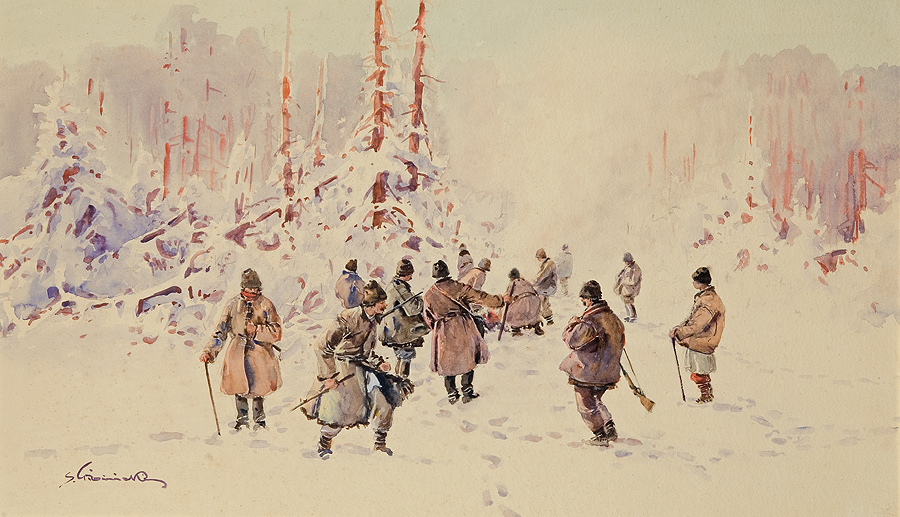 Stanisław Gibiński (Rzeszów 1882 – Katowice 1971) od wczesnej młodości pracował na kolei, początkowo w Rzeszowie, następnie w Krakowie, gdzie równocześnie mógł podjąć naukę w Akademii Sztuk Pięknych, prawdopodobnie jako wolny słuchacz. W czasie I wojny światowej służył w II Brygadzie Legionów dowodzonej przez J. Hallera i odbył kampanię w Karpatach, walcząc pod Rafajłową, Mołodecznem, Przełęczą Pantyrską. Po wojnie nadal pracował na kolei, łącząc pracę zawodową z twórczością plastyczną. Był malarzem akwarelistą; malował pejzaże, wiejskie sceny rodzajowe, rybaków czy polowania, które najczęściej przedstawiał w śnieżnym, zimowym pejzażu. Sam często uczestniczył w polowaniach i ten temat znał doskonale. Malował też moczary, rozlewiska, krajobrazy jesienne. W jego malarstwie wyraźnie widoczne są inspiracje sztuką Fałata, ale też Wyczółkowskiego i malarzy krakowskiej szkoły pejzażu. Artysta wielokrotnie uczestniczył w wystawach krakowskiego TPSP, a po 1926 także w wystawach „Niezależnych“. Wystawiał też i w innych miastach, a jego sztuka cieszyła się znacznym powodzeniem
