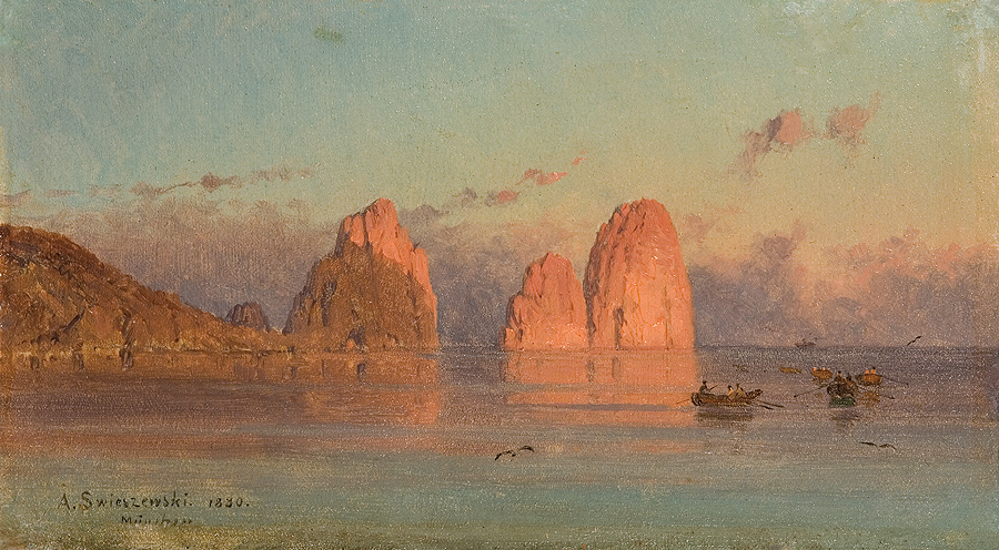 Aleksander Świeszewski był malarzem pejzażystą, jednym z przedstawicieli polskiej kolonii artystycznej w Monachium. Naukę malarstwa rozpoczął w warszawskiej Szkole Sztuk Pięknych, jako uczeń Christiana Breslauera. W roku 1863 walczył w powstaniu styczniowym; po jego upadku wyjechał do Monachium i kształcił się w tamtejszej Akademii u prof. Fritza Bambergera. Wiele podróżował – był we Włoszech i Francji, wyjeżdżał do Tyrolu i Szwajcarii. W 1873 zamieszkał na stałe w Monachium. Często jednak przejeżdżał do kraju; chętnie odwiedzał Tatry. W czasie podróży wykonywał studia i malarskie szkice z natury, które służyły mu później przy malowaniu obrazów, wykańczanych już w pracowni. Najchętniej malował krajobrazy górskie, często oświetlone promieniami zachodzącego słońca. Przedstawiał też pejzaże nadmorskie i ogrody ze starożytnymi ruinami. Artysta wystawiał w wielu miastach europejskich, a także w kraju; w Zachęcie w Warszawie i Towarzystwie Przyjaciół Sztuk Pięknych w Krakowie (w latach 1864-1895 niemal corocznie). Jego obrazy cieszyły się niekłamanym uznaniem krytyki oraz powodzeniem u publiczności. W 1881 jeden z pejzaży kupił sam Ludwik II, król Bawarii. Po śmierci artysty, w monachijskim Kunstvereinie – w kwietniu 1896 – urządzono wystawę jego spuścizny twórczej. Wówczas to – jak pisał monachijski krytyk – „można było stwierdzić jak bardzo był on oddany sztuce. Każde studium pokazuje, jak potrafił z wielką techniczną umiejętnością oddać szlachetnie rozumianą, głęboko odczutą naturę [..] wszystkie przenikał poetyczny urok”. (cyt. za: H.Stępień, M.Liczbińska, Artyści polscy w środowisku monachijskim w latach 1828-1914. Materiały źródłowe, Warszawa 1994, s. 97).