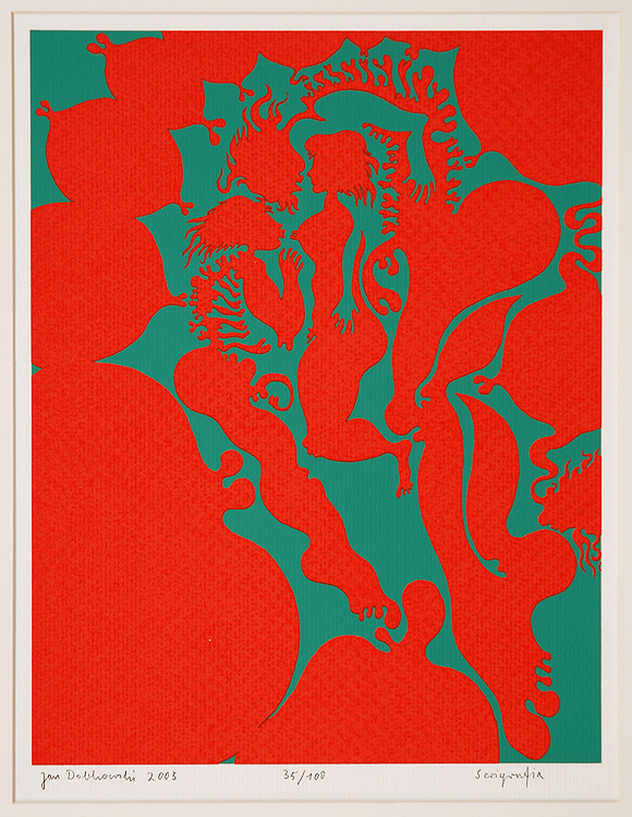 Jan Dobkowski (Łomża 1942, mieszka w Warszawie) studiował w latach 1962-1968 na Wydziale Malarstwa warszawskiej ASP pod kierunkiem prof. Juliusza Studnickiego i Jana Cybisa. Będąc jeszcze na studiach, w 1966, utworzył duet artystyczny, w którym jego partnerem był Jerzy (Jurry) Zieliński. Ich pierwsza wspólna wystawa pn. Neo-Neo-Neo odbyła się w Warszawie w 1967. Wystawiali wspólnie do 1970. W 1968 powstały pierwsze zielono-czerwone obrazy Dobkowskiego (używającego w tym czasie pseudonimu Dobson). W pracach tych, operujących giętkimi, falistymi liniami, w których upatrywano wpływów secesji, artysta używał sposobów rodem z op-artu dla wywołania złudzeń optycznych (wirowanie, mżenie, pozorny ruch form). Równolegle z obrazami tworzył też formy z płyt i folii do montowania w przestrzeni. Złoty medal na Sympozjum Złotego Grona w Zielonej Górze w 1971 i blisko roczny pobyt w USA na stypendium Fundacji Kościuszkowskiej w 1972 to kolejne etapy pełnej sukcesów kariery malarza. Wyraźną zmianę nastroju i wymowy jego prac przyniosły wydarzenia 1980-1981 roku, zwłaszcza wprowadzenie stanu wojennego. Monochromatyczne, ciemne płótna znaczył wtedy nikłymi, wiotkimi liniami rysunku. Najczęstszym motywem były patriotyczne i religijne symbole, dopowiadane tytułami nawiązującymi do realiów czasu. Kolejna radykalna zmiana nastąpiła ok. 1990. Symbolicznym zwiastunem nowego okresu stał się olbrzymi, radosny, eksplodujący bogactwem barw, kształtów i ruchu obraz ...a życie sobie płynie... (394 x 588 cm) z 1990-1991. Podobne cechy formalne charakteryzują twórczość artysty w całej dekadzie lat 90. Równolegle z malarstwem Dobkowski pracuje nad rysunkiem, będącym bardzo ważnym dopełnieniem jego twórczości.