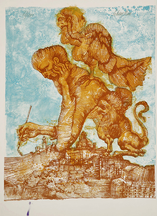 Jan Lebenstein (Brześć Litewski 1930 - Kraków 1999) w latach 1948-1954 studiował malarstwo w ASP w Warszawie pod kierunkiem prof. Eugeniusza Eibischa i Artura Nachta-Samborskiego. W 1955 wziął udział w wystawie w warszawskim Arsenale. Zaprzyjaźniony w czasie studiów z Mironem Białoszewskim, swą pierwszą wystawę indywidualną pokazał w 1956 w Teatrze na Tarczyńskiej. W 1959 zdobył Grand Prix de la Ville de Paris na I Biennale Młodych w Paryżu i w tym roku przeniósł się na stałe do Paryża. Po seriach "figur kreślonych" (na papierze milimetrowym) i "figur hieratycznych" z lat 1955-1958 maluje cykl "figur osiowych" (1958-1962), które wystawia w Paryżu i USA. Równolegle w 1960 zaczyna rysowane "karnety", rodzaj dziennika, który w przyszłości dostarczy motywów wykorzystanych w obrazach. W latach 1964-1965 maluje "Bestiarium", cykl fakturowych, archaizowanych stworów przypominających prehistoryczne wykopaliska. Bezpośrednio po nich wprowadza do swych obrazów postaci ludzkie i fantastyczne, odgrywające sceny ni to mitologiczne, ni to ze snu, często przesycone erotyką. W 1970 projektuje witraże dla Centre du Dialogue w Paryżu. W W 1971 otrzymuje obywatelstwo francuskie 1974 powstają gwasze inspirowane Folwarkiem zwierzęcym George'a Orwella. W latach 1976-1989 tworzy wyłącznie w technice gwaszu i pastelu, podejmując tematykę mitologiczną i zaczerpniętą z Biblii: cykle ilustracji do Księgi Hioba (wyd. 1979) i do Apokalipsy (wyd. 1986) w nowych przekładach Czesława Miłosza. W 1989 powraca do malarstwa olejnego (cykl "Pergamon"). Artysta otrzymał m. in. nagrodę Fundacji im. Alfreda Jurzykowskiego w 1976, Nagrodę Muzeum Archidiecezji Warszawskiej w 1985, Nagrodę im. Jana Cybisa w 1987.