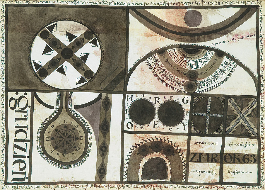 Zbigniew Makowski (Warszawa 31 I 1930 - Warszawa 19 VIII 2019) studiował w ASP w Warszawie w latach 1950-1956, dyplom uzyskał w pracowni Kazimierza Tomorowicza. Początkowo skłaniał się ku surrealizmowi - podczas pobytu w Paryżu w 1962 zetknął się z André Bretonem i międzynarodowym ruchem Phases. Jednak decydujący wpływ na wyraz jego sztuki wywarły pozamalarskie zainteresowania, jakim się oddaje. Jest literatem, poetą, erudytą, zwłaszcza zaś znawcą szerokiego spektrum filozofii i wiedzy tajemnej wielu kultur. Znawstwo to wykorzystuje w swoich pracach malarskich, rysunkowych, a także w unikatowych książkach, które własnoręcznie wykonuje na specjalnie preparowanych papierach. W swych pracach nawarstwia symbole, cytaty i znaczenia w nieczytelny, zdawałoby się, chaos. Wypada jednak wierzyć krytykom, którzy twierdzą, iż prace Makowskiego otwierają przed cierpliwym i intelektualnie przygotowanym „czytelnikiem“ świat swoistej narracji. Sam artysta zaś zwraca uwagę na „permutacyjną“ strukturę swych prac, w których rozmaite cytaty i odniesienia kulturowe przeplatają się z jego prywatną ikonografią. Tak czy inaczej, z pewnością w pracach Makowskiego da się wyróżnić pewien „alfabet“ wizualno-symboliczny, którego elementy pojawiają się w nich stale w różnych konfiguracjach. Należą doń np. takie wizerunki, jak klucz, drabina, studnia, mandala, kielich itp. Otaczają je napisy, często łacińskie, a także pojedyncze cyfry, litery, ornamenty. Określił je ktoś jako rebusy o wielkiej urodzie, które można odczytywać, można też kontemplować. Od roku 1982 artysta przestał wystawiać, ale nie tworzyć. Powstają wówczas prace będące rodzajem nowoczesnego notatnika, rozpoczętego jeszcze w latach 60., do którego artysta powraca z nowymi przemyśleniami. Artysta jest laureatem wielu nagród, m.in. Nagrody Krytyki Artystycznej im. Norwida (1973) i Nagrody im. Jana Cybisa (1992). Jego wielka kompozycja "Mirabilitas secundum diversos modos exire potest a rebus" (1973-1980) zdobi genewską siedzibę ONZ jako dar rządu polskiego.