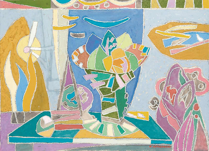 Kazimierz "Kachu" Ostrowski od 1920 mieszkał w Poznaniu, od 1934 w Gdyni. Podczas wojny był więźniem obozu koncentracyjnego w Stutthofie. W 1945 wstąpił do Państwowej Wyższej Szkoły Sztuk Plastycznych w Sopocie, gdzie studiował malarstwo pod kierunkiem Janusza Strzałeckiego, Artura Nachta-Samborskiego i Jacka Żuławskiego. W latach 1949-1950 przebywał w Paryżu na stypendium rządu francuskiego. Uczęszczał do pracowni Fernanda Légera. Po powrocie do kraju zajmował się malarstwem, rysunkiem, projektowaniem tkanin oraz malarstwem ściennym i witrażem. Wykonywał m.in. polichromie fasad odbudowanych kamienic Starego Miasta w Gdańsku i Poznaniu. W latach 1964-1987 pracował jako pedagog w Państwowej Wyższej Szkole Sztuk Plastycznych w Gdańsku. Malarstwo Ostrowskiego wiele zawdzięcza kontaktom ze sztuką Légera i innych przedstawicieli awangardy XX wieku. Artysta tworzy kompozycje zbudowane z uproszczonych, zgeometryzowanych elementów, odznaczające się bogatą kolorystyką i dekoracyjnością. Często podejmował tematykę marynistyczną lub związaną z pracą, wykonywał kompozycje figuralne w typie panneaux. Wielokrotnie wystawiał na przeglądowych wystawach, m.in. III i IV Ogólnopolskiej Wystawie Plastyki, 1953 i 1954, II i III Wystawie Sztuki Nowoczesnej, Warszawa 1957 i 1959, Wystawie Malarstwa w XV-lecie PRL, Muzeum Narodowe, Warszawa 1961, Festiwalach Polskiego Malarstwa Współczesnego w Szczecinie 1962, 1966, 1968, 1970, 1972, 1982. W roku 1988 został laureatem prestiżowej nagrody im. Jana Cybisa.