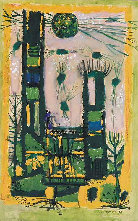 Rajmund Ziemski (Radom 1930 - Warszawa 2005) studiował malarstwo w latach 1949-1955 pod kierunkiem Artura Nachta-Samborskiego w Akademii Sztuk Pięknych w Warszawie. W roku dyplomowym wziął udział w Ogólnopolskiej Wystawie Młodej Plastyki w warszawskim Arsenale. Od 1958 wykłada w macierzystej uczelni, prowadząc w niej pracownię malarstwa, jedną z najchętniej wybieranych przez studentów jako pracownia dyplomowa. Prowadzący ją profesor jest również autorytetem artystycznym, jednym z najwybitniejszych przedstawicieli nurtu abstrakcji niegeometrycznej w polskim malarstwie powojennym. We wczesnym cyklu „Ptaki“ (1957-1958) operował kształtami bardzo uproszczonymi, malowanymi impasto na tłach zazwyczaj ciemnych, często o bogatej fakturze. Od początku lat 60. obrazy Ziemskiego przybrały charakterystyczny kształt wydłużonego prostokąta, w którego polu, niczym rozpięte, dramatyczne płachty, rozpościerały się aluzyjne pola koloru i faktury. Nosiły tytuły sugerujące związki z naturą, jednak górę w nich bierze zainteresowanie malarza kolorem i materią, traktowanymi autonomicznie, w oderwaniu od jakichkolwiek sugestii przedmiotowych. Te powróciły w znamiennym epizodzie z połowy lat 60., kiedy to artysta włączał w strukturę swych obrazów, często wtedy łączonych w Tryptyki, fotograficzne wizerunki twarzy ludzkich. Potem zarzucił ten proceder na rzecz dalszego rozwijania prób kolorystycznych, idących w kierunku ostrych kontrastów i niekiedy kakofonicznych zestawień. Pozostaje przy tym przy ustalonym jeszcze w latach 60. sposobie tytułowania i oznaczania prac (wielki, malowany do dziś cykl „Pejzaże“ z obrazami numerowanymi liczbą łamaną przez datę roczną).