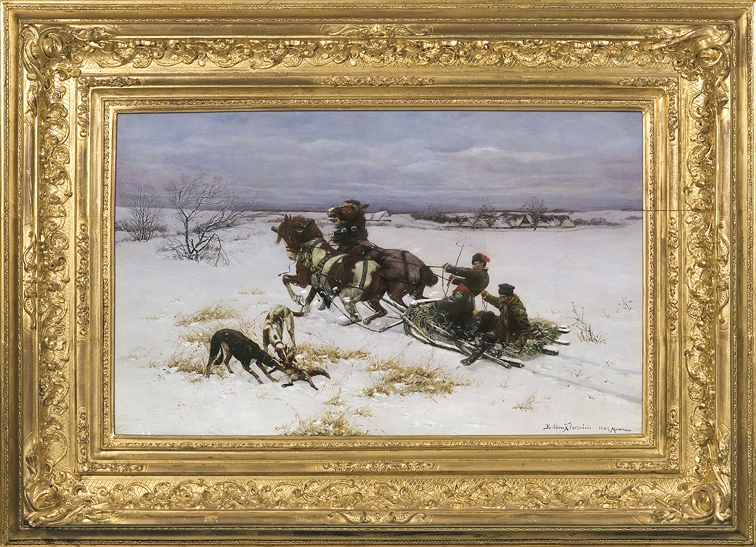 Artysta powtórzył tu centralny motyw - jadących saniami myśliwych, charty, lisa - ze swego wcześniejszego (1882) obrazu, znanego z reprodukcji zamieszczonej w warszawskich „Kłosach“ w 1889 (patrz: „Kłosy“ 1889, nr 1238, il. s.184).