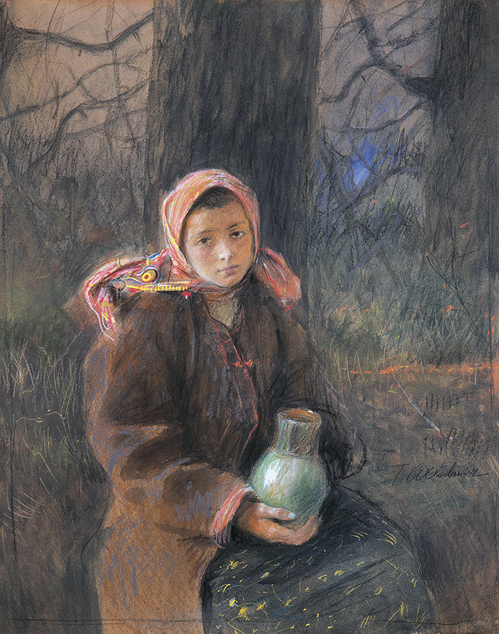 Teodor Axentowicz (Braszów w Siedmiogrodzie 1859 - Kraków 1938) – malarz, pastelista, litograf – był jednym z najbardziej znanych i cenionych malarzy polskich. Kształcił się w Akademii Sztuk Pięknych w Monachium pod kierunkiem Gabriela Hackla, Aleksandra Wagnera, Gyuli Benczúra. Studia uzupełniał w Paryżu, gdzie następnie przebywał przez lat kilkanaście. Brał udział w paryskich Salonach; w 1890 otrzymał członkostwo Société Nationale des Beaux-Arts. W tym czasie wielokrotnie wyjeżdżał również do Londynu. W 1895 powrócił do kraju i zamieszkał na stałe w Krakowie, powołany na profesora tamtejszej Szkoły Sztuk Pięknych (od 1900 Akademii). W uczelni tej nauczał nieprzerwanie do 1934, dwukrotnie pełniąc funkcję rektora (lata 1910-11 oraz 1927-28). Był jednym z członków-założycieli Towarzystwa Artystów Polskich „Sztuka”, członkiem wiedeńskiej „Secesji” i współpracownikiem jej pisma „Ver Sacrum”. Powodzenie przyniosły mu zwłaszcza idealizowane wizerunki wytwornych dam oraz wdzięczne portrety dziecięce. Malował też obrazy o tematyce rodzajowej; był jednym z pierwszych malarzy Huculszczyzny i Hucułów. Tworzył obrazy historyczne i kompozycje symboliczne związane z upływem czasu, przemijaniem, starością. We wczesnym, monachijskim okresie były to obrazy utrzymane w duchu akademickiego realizmu; na późniejszą twórczość artysty wywarło wpływ angielskie malarstwo XVIII w. oraz dzieła malarzy współczesnych - Boldoniego, Whistlera, Sargenta. Jego obrazy cechuje dekoracyjność, elegancja, świeżość subtelnej gamy kolorów i delikatna secesyjna stylizacja. Początkowo malował olejno i akwarelą, a po 1890 przede wszystkim mistrzowsko opanowaną techniką pastelu. Zajmował się ilustratorstwem i litografią, projektował plakaty wystaw „Sztuki”.