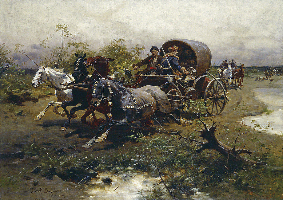 Józef Brandt (Szczebrzeszyn 1841 - Radom 1915) był jednym z najwybitniejszym polskich malarzy batalistów. Naukę malarstwa rozpoczął w Warszawie pod okiem Juliusza Kossaka. W latach 1858-1860 był w Paryżu, gdzie podjął studia inżynierskie. Niebawem zarzucił je jednak na rzecz malarstwa i kształcił się w pracowni Leona Cognieta. Po powrocie do kraju, w 1861 debiutował na wystawie w warszawskim TZSP. Od 1863 kontynuował studia w monachijskiej ASP u Franza Adama. W 1870 otworzył w Monachium własną pracownie i niebawem stał się przywódcą, „generałem” tamtejszej polskiej kolonii artystycznej i nauczycielem wielu malarzy. Po 1877 miesiące letnie spędzał w Orońsku, zapraszając na plenery grono swych uczniów. Został honorowym profesorem Akademii w Monachium (1878), członkiem Akademii w Berlinie (1877) i Pradze (1900). Odznaczony wysokimi orderami, wyróżniany medalami i nagrodami na międzynarodowych wystawach, cieszył się prawdziwie europejską sławą. Mieszkając i tworząc poza krajem zawsze wyraźnie podkreślał swoją polskość; dając jej wyraz choćby poprzez podpisywanie obrazów Józef Brandt z Warszawy. Malował bitwy, potyczki, podjazdy – epizody z historii polskich wojen kresowych i wojen szwedzkich XVII wieku, a także sceny rodzajowe – jeźdźców, polowania, jarmarki. Jego barwne, pełne ruchu i perfekcyjne warsztatowo obrazy podziwiano powszechnie, jako najlepszy przykład wysoko wówczas cenionej „szkoły polskiej”. Ale podczas gdy niemiecki czy francuski widz dostrzegał w nich przede wszystkim egzotykę i barwy Orientu, dla Polaków były to płótna „prawdziwe, naturalne, swojskie jak fragmenty z pamiętników Paska albo Rzewuskiego, przetransponowane na barwy i linie”. |