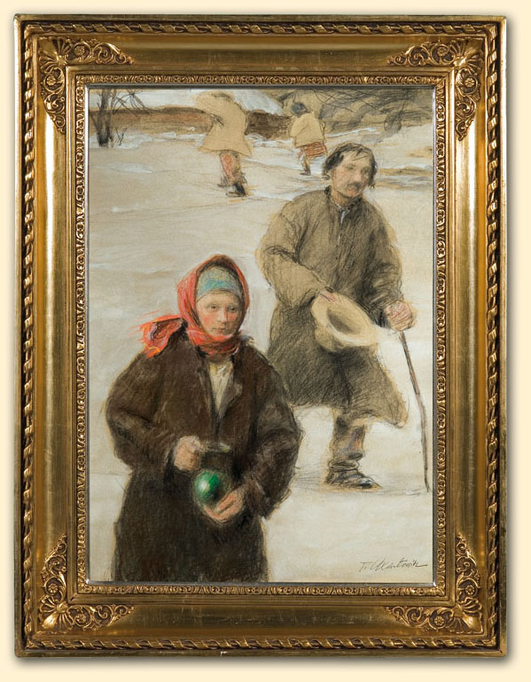 Teodor Axentowicz (Braszów w Siedmiogrodzie 1859 - Kraków 1938) – malarz, pastelista, litograf – był jednym z najbardziej znanych i cenionych malarzy polskich. Kształcił się w Akademii Sztuk Pięknych w Monachium pod kierunkiem Gabriela Hackla, Aleksandra Wagnera, Gyuli Benczúra. Studia uzupełniał w Paryżu, gdzie następnie przebywał przez lat kilkanaście. Brał udział w paryskich Salonach; w 1890 otrzymał członkostwo Société Nationale des Beaux-Arts. W tym czasie wielokrotnie wyjeżdżał również do Londynu. W 1895 powrócił do kraju i zamieszkał na stałe w Krakowie, powołany na profesora tamtejszej Szkoły Sztuk Pięknych (od 1900 Akademii). W uczelni tej nauczał nieprzerwanie do 1934, dwukrotnie pełniąc funkcję rektora (lata 1910-11 oraz 1927-28). Był jednym z członków-założycieli Towarzystwa Artystów Polskich „Sztuka”, członkiem wiedeńskiej „Secesji” i współpracownikiem jej pisma „Ver Sacrum”. Powodzenie przyniosły mu zwłaszcza idealizowane wizerunki wytwornych dam oraz wdzięczne portrety dziecięce. Malował też obrazy o tematyce rodzajowej; był jednym z pierwszych malarzy Huculszczyzny i Hucułów. Tworzył obrazy historyczne i kompozycje symboliczne związane z upływem czasu, przemijaniem, starością. We wczesnym, monachijskim okresie były to obrazy utrzymane w duchu akademickiego realizmu; na późniejszą twórczość artysty wywarło wpływ angielskie malarstwo XVIII w. oraz dzieła malarzy współczesnych - Boldoniego, Whistlera, Sargenta. Jego obrazy cechuje dekoracyjność, elegancja, świeżość subtelnej gamy kolorów i delikatna secesyjna stylizacja. Początkowo malował olejno i akwarelą, a po 1890 przede wszystkim mistrzowsko opanowaną techniką pastelu. Zajmował się ilustratorstwem i litografią, projektował plakaty wystaw „Sztuki”.