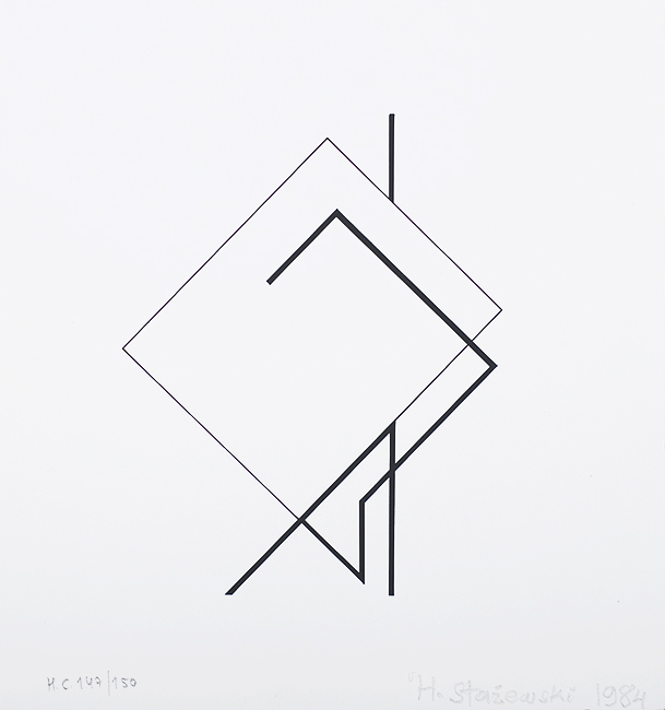 Henryk Stażewski (Warszawa 9 I 1894 - Warszawa 10 VI 1988) studiował w Szkole Sztuk Pięknych w Warszawie w latach 1913-1920. W początkach kariery malował martwe natury. Przejściowo wystawiał z ugrupowaniem „Formiści” (1922). Wziął też udział w Wystawie Nowej Sztuki w Wilnie w 1923. O tego czasu tworzył pod wpływem konstruktywizmu. Obok kompozycji malarskich trudnił się grafiką książkową, projektował wnętrza, sprzęty, a także scenografie – były to w większości prace teoretyczne i studyjne. Polskie i międzyna-rodowe ugrupowania awangardy, z którymi wystawiał i współpracował jako publicysta, to kolejno: „Blok” (1924-1926), „Praesens” (1926-1930), „Cercle et Carré” (1929-1931), „Abstraction-Création” (1931-1939), „a. r.” (1932-1939). Należał też do Koła Artystów Grafików Reklamowych (1933-1939). W 1930 był współorganizatorem zbiórki dzieł artystów międzynarodowej awangardy przeznaczonych dla muzeum łódzkiego (obecnie w Muzeum Sztuki w Łodzi). Po II wojnie mieszkał i działał w Warszawie. W latach 40. i 50. podejmował próby dostosowania się do postulatów sztuki figuratywnej. Z tego okresu pochodzą rysunkowe i malarskie kompozycje o tematyce pracy, budowy, a także projekty monumentalne. Po 1956, uznawany powszechnie za patrona polskiej awangardy, uprawiał już wyłącznie abstrakcję o konstruktywistycznym rodowodzie. Tworzył cykle prac, będących studiami płaszczyzn, linii, kolorów w różnych układach względem siebie. Przy pozorach chłodnej perfekcji umiał nasycić je emocją bezpośredniego dotknięcia, śladu ręki. Obok malarstwa i form pochodnych, jak collages, reliefy, multiple, tworzył formy przestrzenne i grafikę (autoryzował serigraficzne repliki swoich prac). Był laureatem wielu nagród i odznaczeń krajowych i zagranicznych, w tym Nagrody Herdera, Wiedeń 1972.