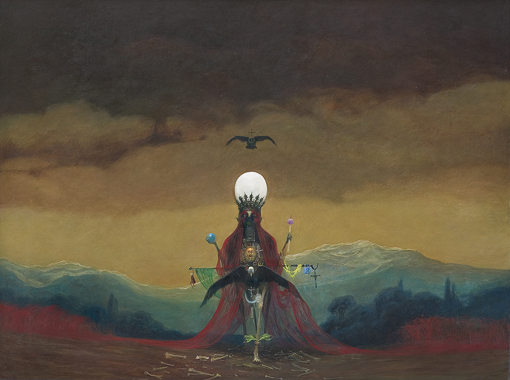 Zdzisław Beksiński (Sanok 24 II 1929 - Warszawa 21 II 2005) studiował w latach 1947-1952 na Wydziale Architektury Politechniki Krakowskiej. Był artystą samoukiem, który osiągnął niekwestionowaną pozycję w polskiej sztuce współczesnej, potwierdzoną obecnością jego prac na prestiżowych wystawach i w kolekcjach muzealnych. Początkowo zajmował się fotografią, którą interesował się od lat studenckich, po 1956 zyskując uznanie jako twórca fotogramów o estetyce opartej o efekty fakturowe. W latach 1958-1962 tworzył abstrakcyjne obrazy-reliefy o bogatej fakturze, głównie metalowe, będące odmianą malarstwa materii. Pod koniec tego okresu powstawały ażurowe formy o kształtach figur i pełnoplastyczne rzeźby w metalu. Kolejnym etapem jego twórczości były lata 1962-1974, kiedy poświęcał się głównie rysunkowi. W latach 60. rysował piórkiem i tuszem figuralne kompozycje odznaczające się karykaturalną deformacją postaci. Od końca lat 60. tworzył rysunki węglem i kredkami, będące monochromatyczną odmianą jego równoległej twórczości malarskiej. Od 1974 zajmował się niemal niepodzielnie malarstwem. Jego charakterystyczny styl bazował na perfekcji technicznej, której towarzyszyła niezwykłość wizji. Malował świat po katastrofie, naznaczony piętnem śmierci i rozpadu. Jego obrazy zaludniają postaci i stwory o ludzkich wprawdzie bądź zwierzęcych kształtach, lecz o cechach fantomów, automatów lub rozpadających się trucheł. Artysta nie nadawał swym obrazom i rysunkom tytułów (poza porządkującymi symbolami), akcentując w ten sposób swój brak zainteresowania dla literackiej strony przedstawień. Sam mówił, że malując całkowicie poddaje się wizji, „fotografuje“ ją. W ostatnich latach włączył do swego warsztatu artystycznego elektroniczne techniki generowania obrazu, które wykorzystywał do tworzenia komputerowych fotomontaży. Sztuka Beksińskiego, wielokrotnie wystawiana i omawiana, budzi skrajne emocje wśród znawców i publiczności.