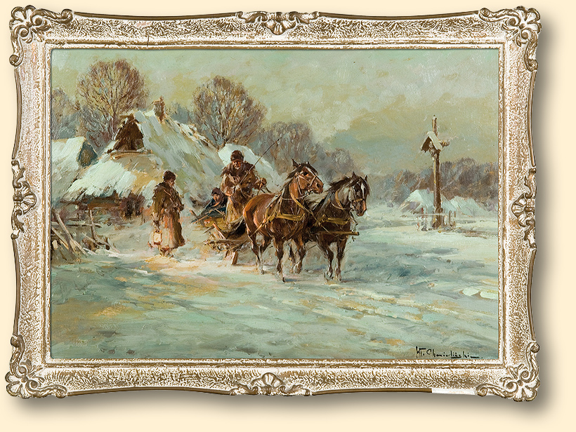 Władysław Chmieliński (Warszawa 1911 - Warszawa 1979) był malarzem związanym z Warszawą, gdzie stale mieszkał i pracował. W latach 1926-1931 studiował w warszawskiej Miejskiej Szkole Sztuk Zdobniczych i Malarstwa (dawna Klasa Rysunkowa). Wiodącym tematem jego obrazów były widoki miejskie, malowane olejno i akwarelą. W latach 1935-1938 stworzył cykl akwarel przedstawiających obiekty polskiej architektury; wśród nich, widoki Sandomierza, Krakowa, Kazimierza nad Wisłą, a także wnętrza zabytkowych kościołów czy pałaców, m.in. Zamku Królewskiego w Warszawie i Pałacu w Wilanowie. Malował także pejzaże i wiejskie sceny rodzajowe – kuligi, sanny, zaprzęgi, wesela, konie na tle krajobrazu. W latach 1967-1969 wyjeżdżał na dłuższe pobyty do Danii. W latach 1936-1939 artysta używał także pseudonimu „Władysław Stachowicz”.