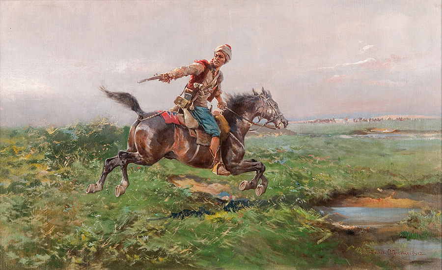Tadeusz Ajdukiewicz (Bochnia 1851 - Kraków 1916) był artystą związanym z mecenatem arystokracji i dworów panujących; w tych kręgach zrobił prawdziwą karierę, a jego obrazy podobały się powszechnie. Studia malarskie rozpoczął w krakowskiej Szkole Sztuk Pięknych. Później kształcił się jeszcze w Wiedniu oraz w Monachium - w Akademii i w pracowni Józefa Brandta. Po studiach przez kilka lat jeździł po polskich dworach kresowych i malował portrety. Około 1877 wyjechał do Paryża, skąd, wraz z Władysławem Branickim wyjechał w – ważną dla jego przyszłej twórczości – podróż na Bliski Wschód. Około roku 1882 zamieszkał w Wiedniu, zajął pracownię po Hansie Makarcie (zm. 1884), malując dla dworu cesarskiego i arystokracji. W 1893 bawił w Londynie, gdzie, m.in. portretował księcia Walii, w 1894 pracował na dworze sułtańskim w Konstantynopolu, następnie także w Sofii, Petersburgu i Bukareszcie. W Rumunii osiadł na dłużej jako malarz nadworny Karola I. Po wybuchu I wojny światowej powrócił do kraju i, mimo starszego wieku, zaciągnął się do Legionów. Zmarł, nie wytrzymawszy trudów wojennych. Malował przede wszystkim portrety - zarówno reprezentacyjne, efektowne i eleganckie (Portret Heleny Modrzejewskiej, MNK), jak również skromne i kameralne. Tworzył też sceny myśliwskie, obrazy o tematyce wschodniej, bohaterskie sceny bitewne, rewie i przeglądy wojsk (Przegląd armii rumuńskiej, 1896).
