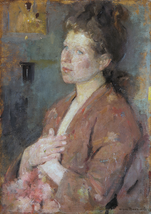 Olga Boznańska (Kraków 1865 - Paryż 1940) – wybitna malarka polska – kształciła się w Krakowie, początkowo pod kierunkiem matki, nauczycielki rysunków Eugenii Mondan, później u J. Siedleckiego, H. Lipińskiego, K. Pochwalskiego. W latach 1884-1886 uczęszczała także na Wyższe Kursy Artystyczne dla Kobiet przy Muzeum Techniczno-Przemysłowym. W 1886 wyjechała do Monachium gdzie uczyła się pod kierunkiem Karla Kricherdorfa i Wilhelma Dürra. Od 1889 pracowała samodzielnie i miała w Monachium własną pracownię. Od 1895 nauczała w prywatnej szkole malarstwa Theodora Humla. Z Monachium wielokrotnie jeździła do kraju, a także do Francji i Szwajcarii. W 1898 przeniosła się na stałe do Paryża, gdzie – przez lata – była jedną z czołowych postaci polskiej kolonii artystycznej. Debiutowała w roku 1886 na wystawie w krakowskim Towarzystwie Przyjaciół Sztuk Pięknych i odtąd stale uczestniczyła w wystawach krajowych i zagranicznych, zdobywając medale i wyróżnienia. W roku 1910 otrzymała francuską Legię Honorową, w roku 1938 order Polonia Restituta. Należała do wielu znaczących – polskich i europejskich – stowarzyszeń artystycznych. Główną domeną jej twórczości był portret – we wcześniejszym, monachijskim okresie często cało postaciowy, monumentalny i zwarty w formie; w czasach paryskich bardziej kameralny, nastrojowy, o zróżnicowanych walorowo plamach barwnych podporządkowanych dominacji jednego tonu, gubiących kontury i zacierających ostrość planów. Malowała też martwe natury i – rzadziej – pejzaże miejskie czy kompozycje rodzajowe.