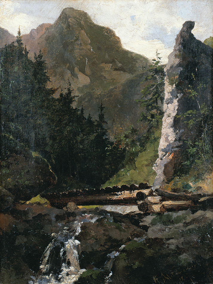 Kazimierz Alchimowicz (Dziembrów na Wileńszczyźnie 1840 - Warszawa 1916) młodzieńcze lata spędził w Wilnie i w okolicach Kijowa, gdzie pracował jako zarządca majątku ziemskiego. Za udział w powstaniu styczniowym został zesłany do Wierchutorii za Uralem i tam zaczął malować amatorsko, a nawet utrzymywał się ze sprzedaży obrazów o tematach religijnych. Właściwe studia malarskie rozpoczął dopiero po powrocie z zesłania (ok. 1869). Początkowo uczył się w warszawskiej Klasie Rysunkowej i w prywatnej pracowni Wojciecha Gersona, później - w latach 1873-1875 - w Akademii monachijskiej u Aleksandra Wagnera, gdzie kilkakrotnie wyróżniono go medalami za prace szkolne. Lata 1876-1878 spędził we Francji, zajmując się m.in. malowaniem na fajansie i porcelanie. Po powrocie do kraju zamieszkał na stałe w Warszawie i od 1890 uczył rysunku w prywatnej szkole B. Poświkowej. Uczestniczył w wielu wystawach, m.in. w Salonach paryskich; wystawiał też w Gandawie, Wiedniu , Berlinie, Monachium, Odessie, w Warszawie, Krakowie i we Lwowie. Jego obrazy nagradzano wielokrotnie; m.in. obraz Milda w 1890 odznaczono I nagrodą w konkursie im. W. Gersona i po roku małym złotym medalem na wystawie w Berlinie; obraz Pogrzeb Gedymina w roku 1888 otrzymał I nagrodę w Petersburgu, a rok później brązowy medal na Wystawie Powszechnej w Paryżu; w konkursach „Tygodnika Ilustrowanego” w 1893 I nagrodą uzyskał obraz Najem robotników, a w 1898 Świtezianka. Uznaniu krytyki towarzyszyło uznanie zbieraczy, wśród których obrazy Alchimowicza zawsze cieszyły się powodzeniem. W swoich obrazach chętnie sięgał do romantycznej, baśniowej tematyki zaczerpniętej najczęściej z dawnych, legendarnych dziejów Litwy. Tworzył także sceny z powstania styczniowego, obrazy rodzajowe, historyczne i religijne, portrety i pejzaże. Wielbiciel poezji Mickiewicza, namalował 12 obrazów na motywach z Pana Tadeusza i wykonał cykl ilustracji do tego poematu. Zajmował się również rzeźbą i malarstwem ściennym.