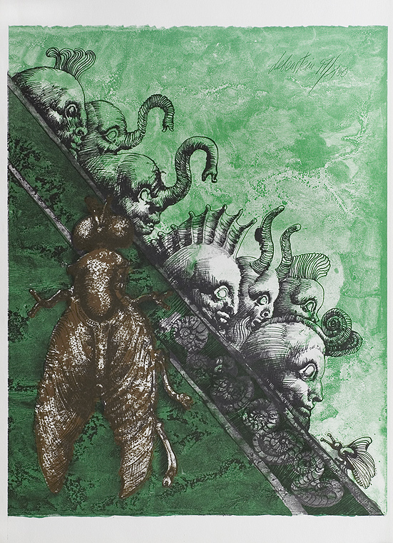 Jan Lebenstein (Brześć Litewski 1930 - Kraków 1999) w latach 1948-1954 studiował malarstwo w ASP w Warszawie pod kierunkiem prof. Eugeniusza Eibischa i Artura Nachta-Samborskiego. W 1955 wziął udział w wystawie w warszawskim Arsenale. Zaprzyjaźniony w czasie studiów z Mironem Białoszewskim, swą pierwszą wystawę indywidualną pokazał w 1956 w Teatrze na Tarczyńskiej. W 1959 zdobył Grand Prix de la Ville de Paris na I Biennale Młodych w Paryżu i w tym roku przeniósł się na stałe do Paryża. Po seriach "figur kreślonych" (na papierze milimetrowym) i "figur hieratycznych" z lat 1955-1958 maluje cykl "figur osiowych" (1958-1962), które wystawia w Paryżu i USA. Równolegle w 1960 zaczyna rysowane "karnety", rodzaj dziennika, który w przyszłości dostarczy motywów wykorzystanych w obrazach. W latach 1964-1965 maluje "Bestiarium", cykl fakturowych, archaizowanych stworów przypominających prehistoryczne wykopaliska. Bezpośrednio po nich wprowadza do swych obrazów postaci ludzkie i fantastyczne, odgrywające sceny ni to mitologiczne, ni to ze snu, często przesycone erotyką. W 1970 projektuje witraże dla Centre du Dialogue w Paryżu. W W 1971 otrzymuje obywatelstwo francuskie 1974 powstają gwasze inspirowane Folwarkiem zwierzęcym George'a Orwella. W latach 1976-1989 tworzy wyłącznie w technice gwaszu i pastelu, podejmując tematykę mitologiczną i zaczerpniętą z Biblii: cykle ilustracji do Księgi Hioba (wyd. 1979) i do Apokalipsy (wyd. 1986) w nowych przekładach Czesława Miłosza. W 1989 powraca do malarstwa olejnego (cykl "Pergamon"). Artysta otrzymał m. in. nagrodę Fundacji im. Alfreda Jurzykowskiego w 1976, Nagrodę Muzeum Archidiecezji Warszawskiej w 1985, Nagrodę im. Jana Cybisa w 1987.
